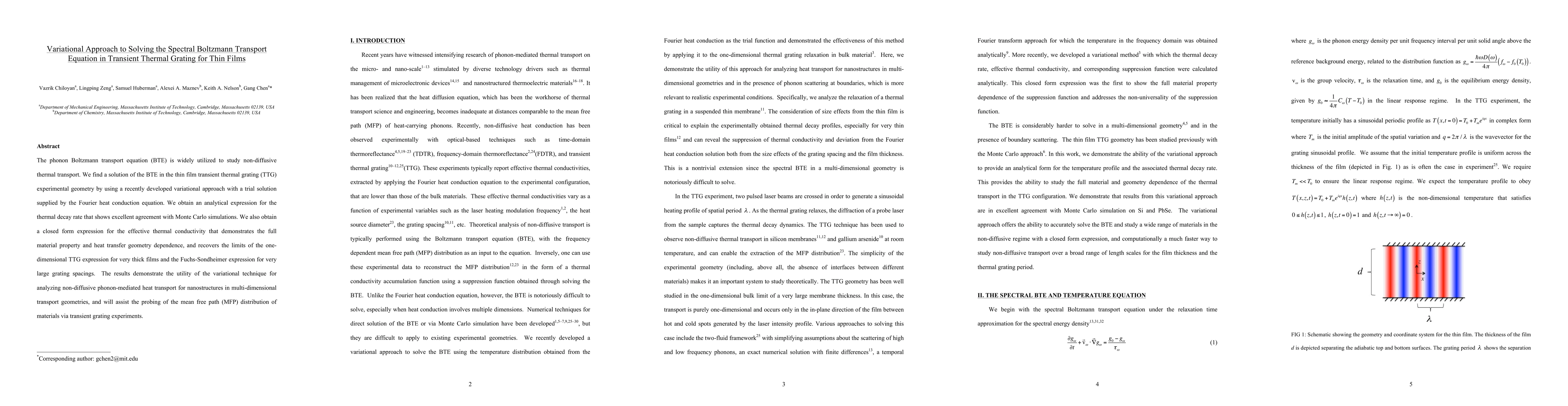 This paper employs a variational approach to solve the phonon Boltzmann transport equation for transient thermal grating in thin films, yielding analytical expressions for thermal decay rate and effective thermal conductivity that agree with Monte Carlo simulations and recover known limits for different film and grating conditions. The method's success highlights its utility for analyzing phonon-mediated heat transport in nanostructures.