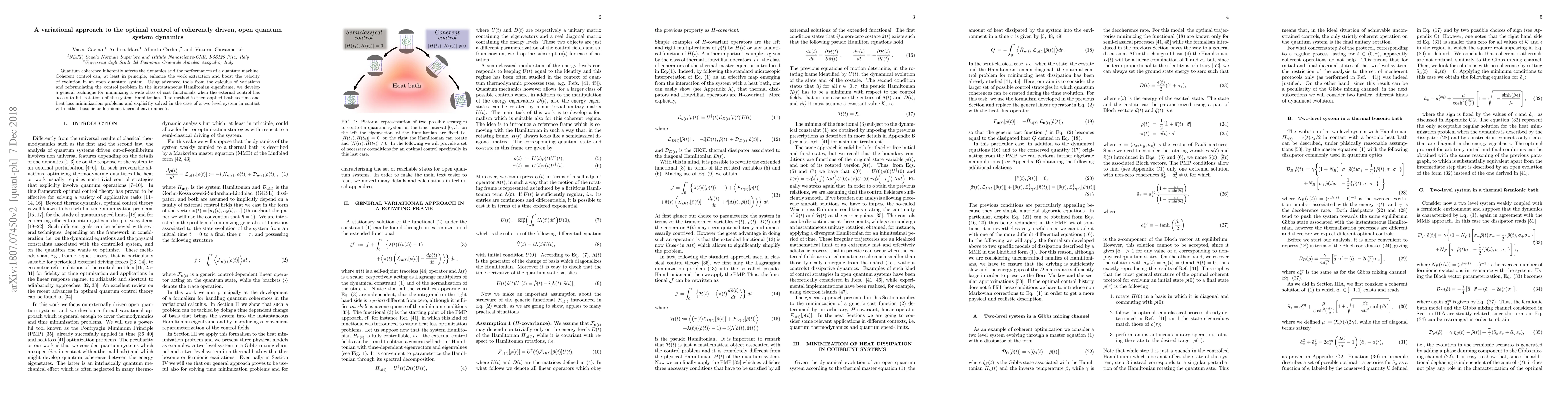 This paper develops a variational approach to optimally control the dynamics of open quantum systems, leveraging coherent control to enhance work extraction and evolution speed. The method minimizes various cost functionals using calculus of variations and is applied to time and heat loss minimization in two-level systems with bosonic or fermionic environments.