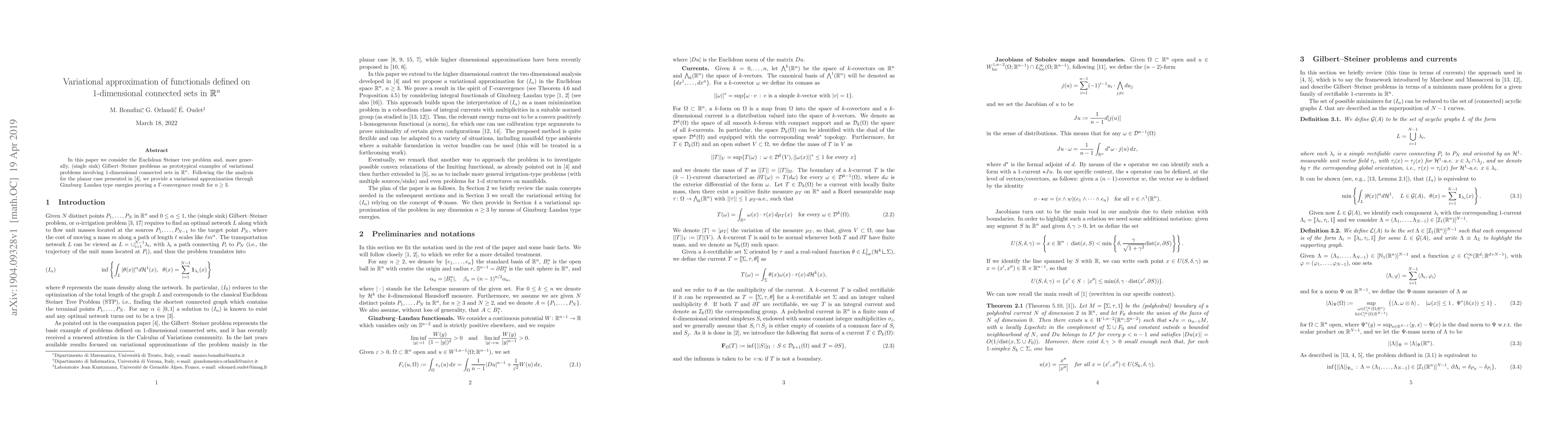 This paper addresses the Euclidean Steiner tree problem and Gilbert-Steiner problems using variational approximation techniques. It proves a $\Gamma$-convergence result for these problems in $\mathbb{R}^n$ for dimensions $n \geq 3$, extending previous planar analysis.
