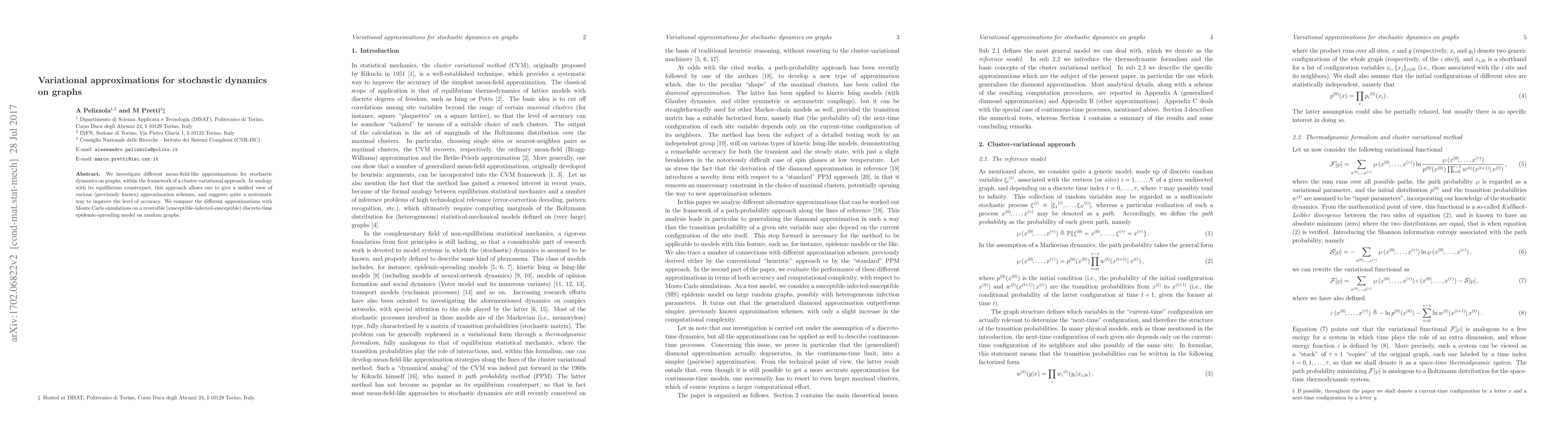 We investigate different mean-field-like approximations for stochastic dynamics on graphs, within the framework of a cluster-variational approach. In analogy with its equilibrium counterpart, this approach allows one to give a unified view of various (previously known) approximation schemes, and suggests quite a systematic way to improve the level of accuracy. We compare the different approximations with Monte Carlo simulations on a reversible (susceptible-infected-susceptible) discrete-time epidemic-spreading model on random graphs.