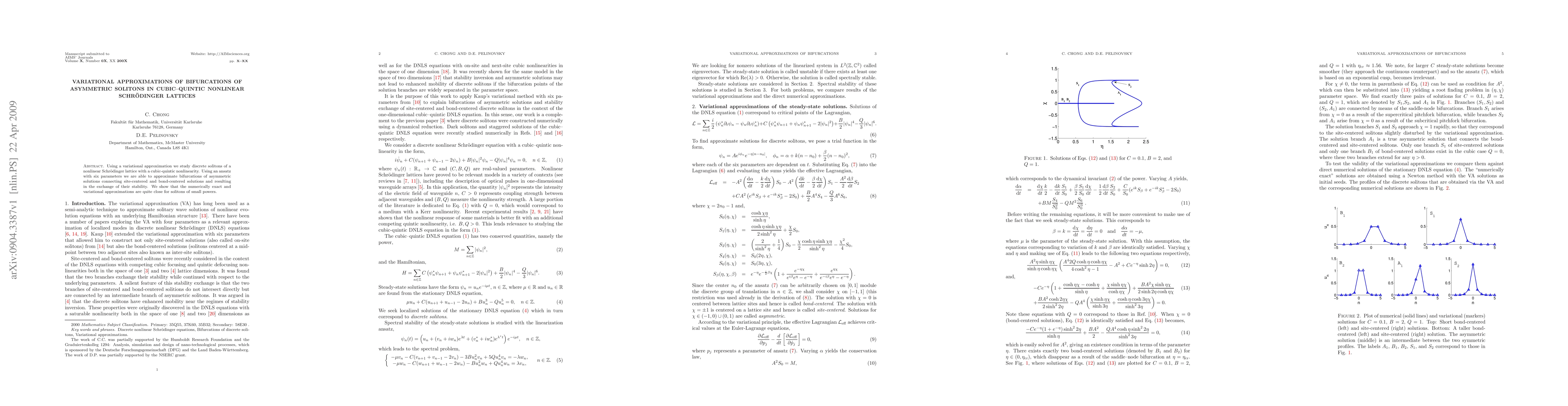 Using a variational approximation we study discrete solitons of a nonlinear Schroedinger lattice with a cubic-quintic nonlinearity. Using an ansatz with six parameters we are able to approximate bifurcations of asymmetric solutions connecting site-centered and bond-centered solutions and resulting in the exchange of their stability. We show that the numerically exact and variational approximations are quite close for solitons of small powers.