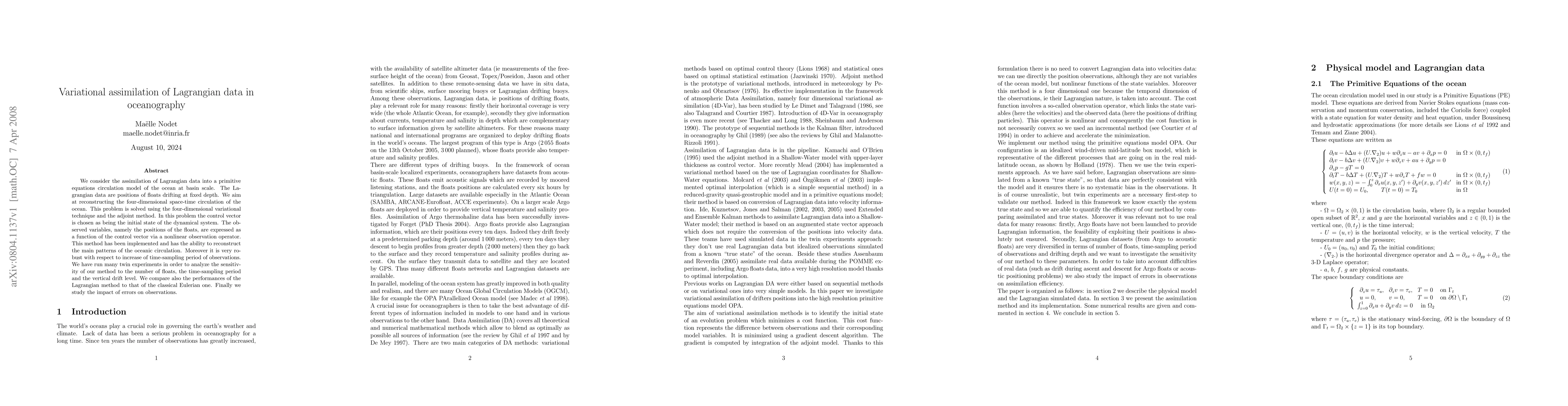 The paper presents an implementation of a Lagrangian variational assimilation method within a primitive equations ocean model, demonstrating its effectiveness in reconstructing ocean circulation patterns from float positions.
