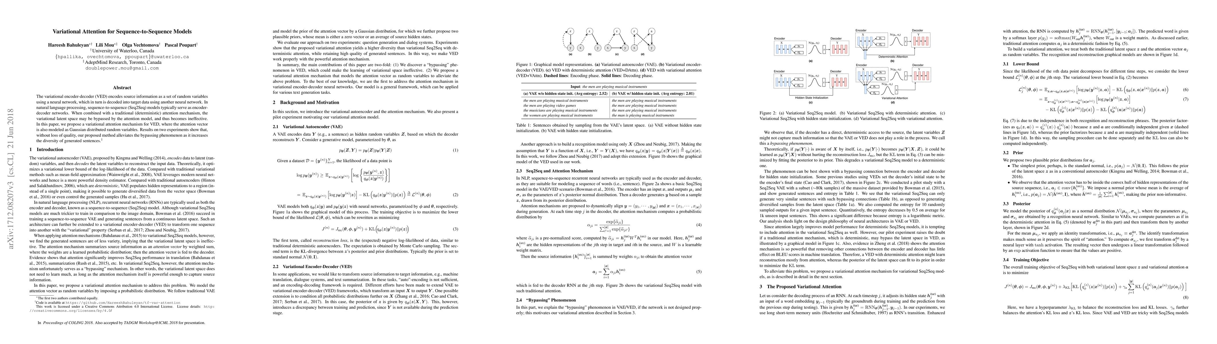 This paper proposes a variational attention mechanism for variational encoder-decoder models to enhance their effectiveness by preventing the bypassing of the variational latent space. The attention vector is modeled as Gaussian random variables, resulting in increased diversity in generated sentences without compromising quality.