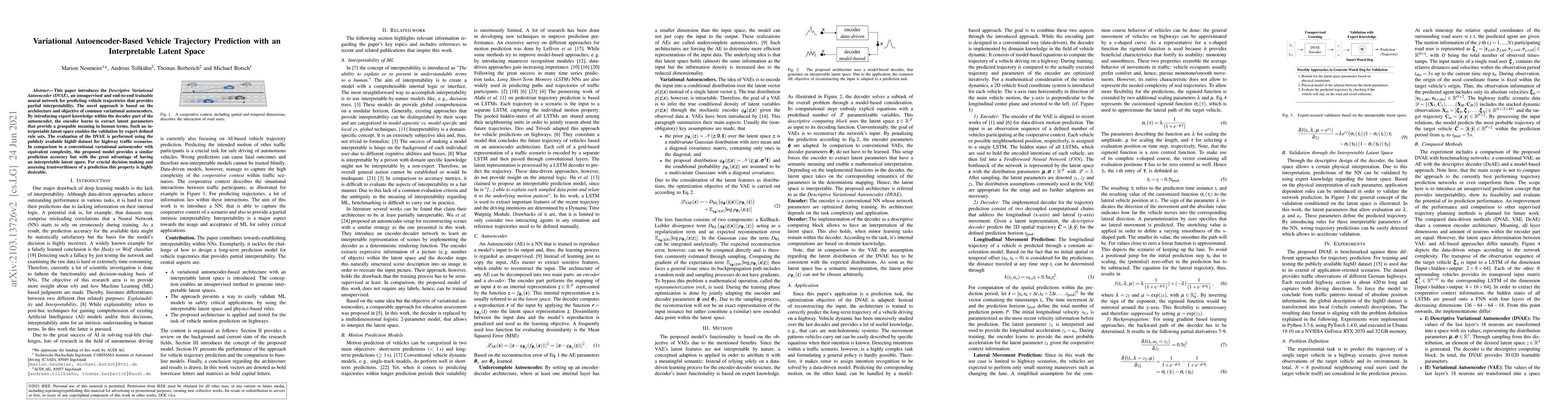 This paper proposes a Descriptive Variational Autoencoder (DVAE) for predicting vehicle trajectories, offering an interpretable latent space through expert knowledge integration. The DVAE achieves comparable prediction accuracy to conventional models while providing valuable insights for decision-making and trustworthiness validation.