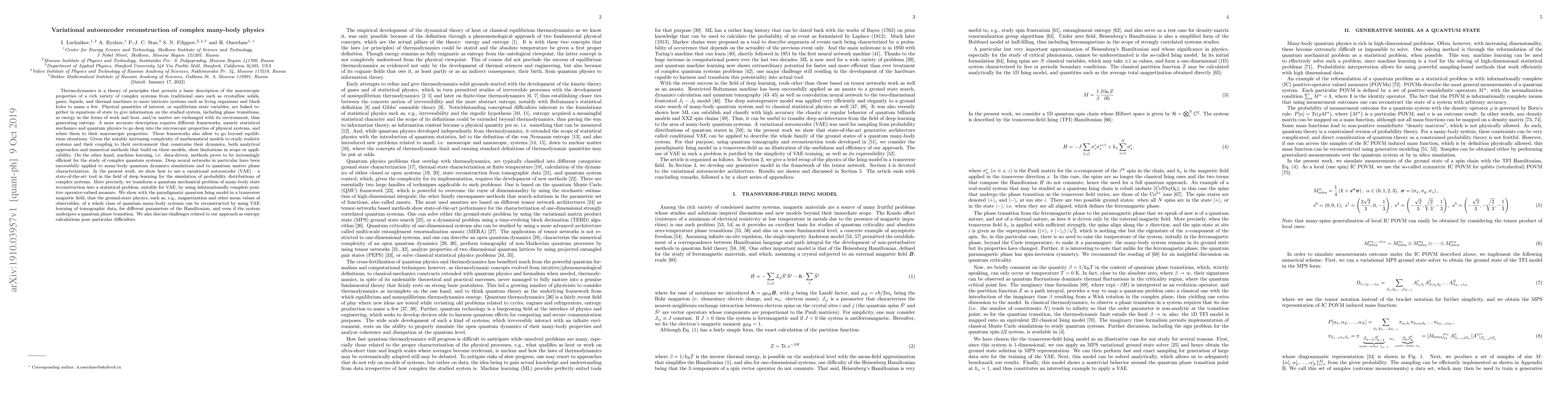 This paper explores the application of variational autoencoders (VAE) for reconstructing complex many-body quantum systems, transforming quantum mechanical problems into statistical problems using tomographic data. The study demonstrates VAE's effectiveness in reconstructing ground-state physics, such as magnetization, in the Ising model, even during quantum phase transitions, while acknowledging challenges like entropy calculations.