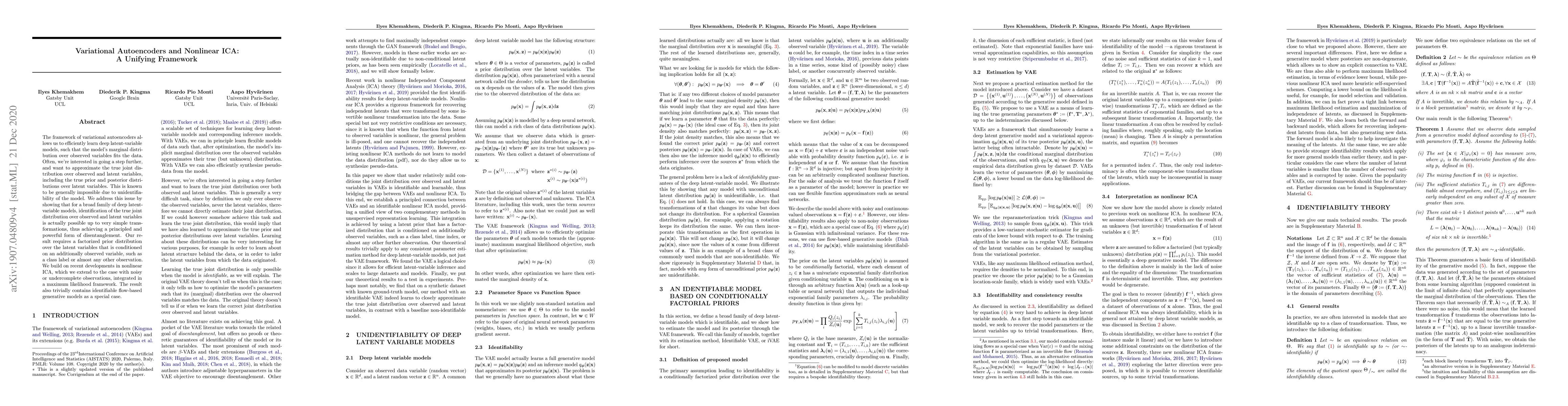 The framework of variational autoencoders allows us to efficiently learn deep latent-variable models, such that the model's marginal distribution over observed variables fits the data. Often, we're interested in going a step further, and want to approximate the true joint distribution over observed and latent variables, including the true prior and posterior distributions over latent variables. This is known to be generally impossible due to unidentifiability of the model. We address this issue by showing that for a broad family of deep latent-variable models, identification of the true joint distribution over observed and latent variables is actually possible up to very simple transformations, thus achieving a principled and powerful form of disentanglement. Our result requires a factorized prior distribution over the latent variables that is conditioned on an additionally observed variable, such as a class label or almost any other observation. We build on recent developments in nonlinear ICA, which we extend to the case with noisy, undercomplete or discrete observations, integrated in a maximum likelihood framework. The result also trivially contains identifiable flow-based generative models as a special case.