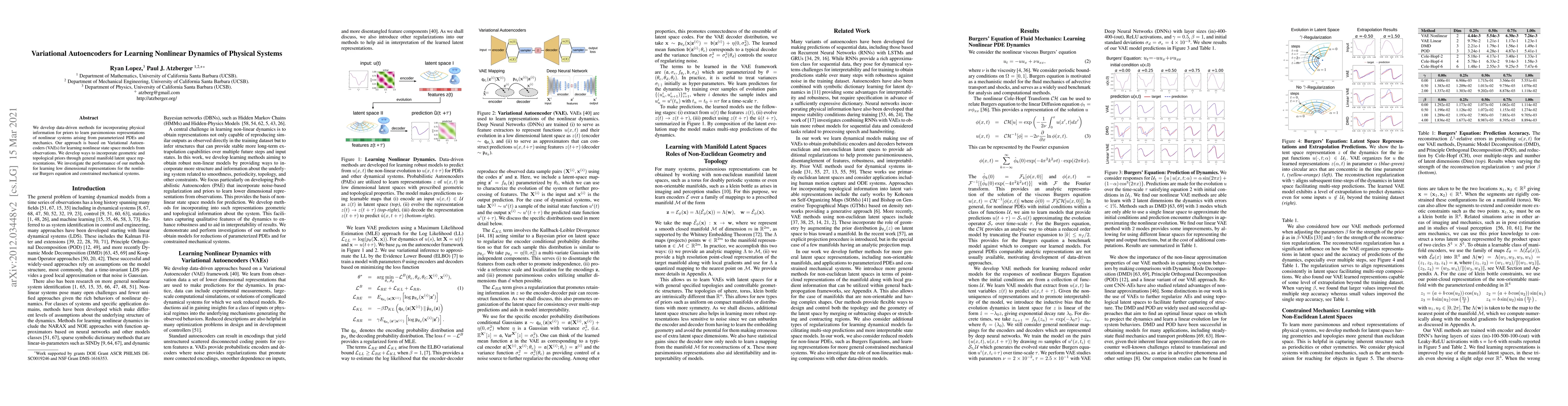 We develop data-driven methods for incorporating physical information for priors to learn parsimonious representations of nonlinear systems arising from parameterized PDEs and mechanics. Our approach is based on Variational Autoencoders (VAEs) for learning from observations nonlinear state space models. We develop ways to incorporate geometric and topological priors through general manifold latent space representations. We investigate the performance of our methods for learning low dimensional representations for the nonlinear Burgers equation and constrained mechanical systems.