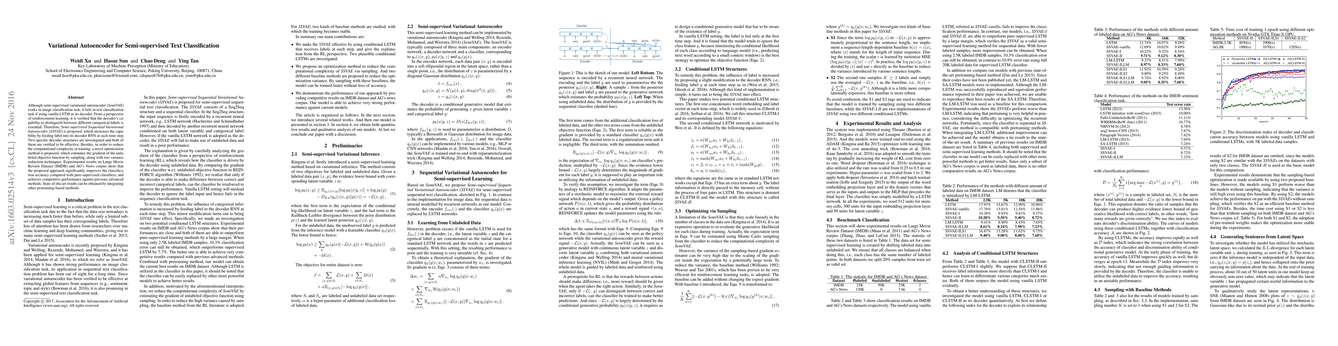 The paper proposes a Semi-supervised Sequential Variational Autoencoder (SSVAE) to enhance semi-supervised text classification, addressing the limitations of vanilla LSTM decoders by incorporating label information at each time-step. The approach also introduces a novel optimization method to reduce training complexity and achieves state-of-the-art results on IMDB and AG's News datasets.