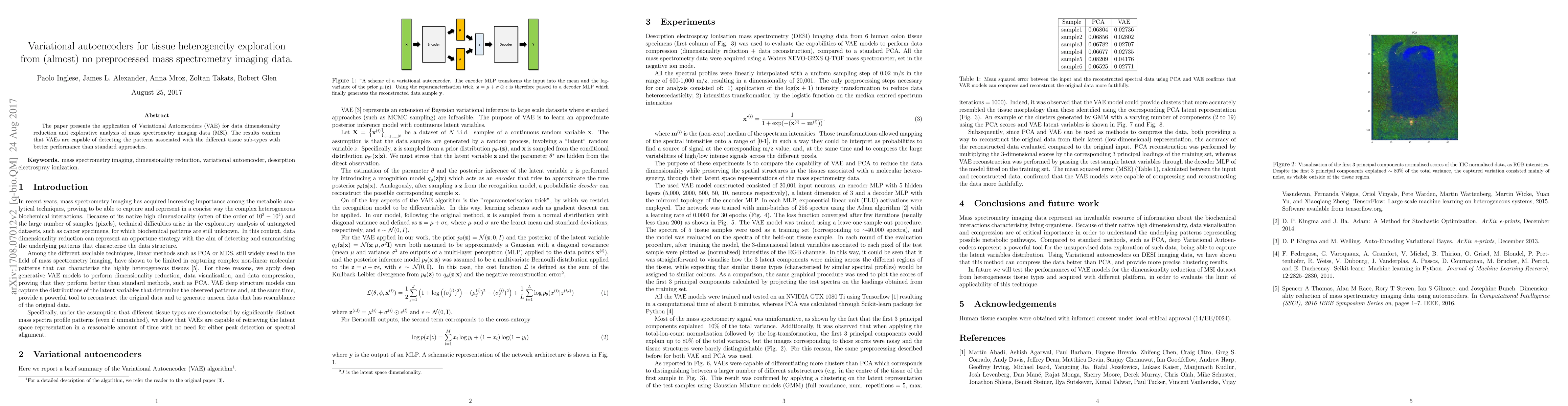 The paper presents the application of Variational Autoencoders (VAE) for data dimensionality reduction and explorative analysis of mass spectrometry imaging data (MSI). The results confirm that VAEs are capable of detecting the patterns associated with the different tissue sub-types with performance than standard approaches.
