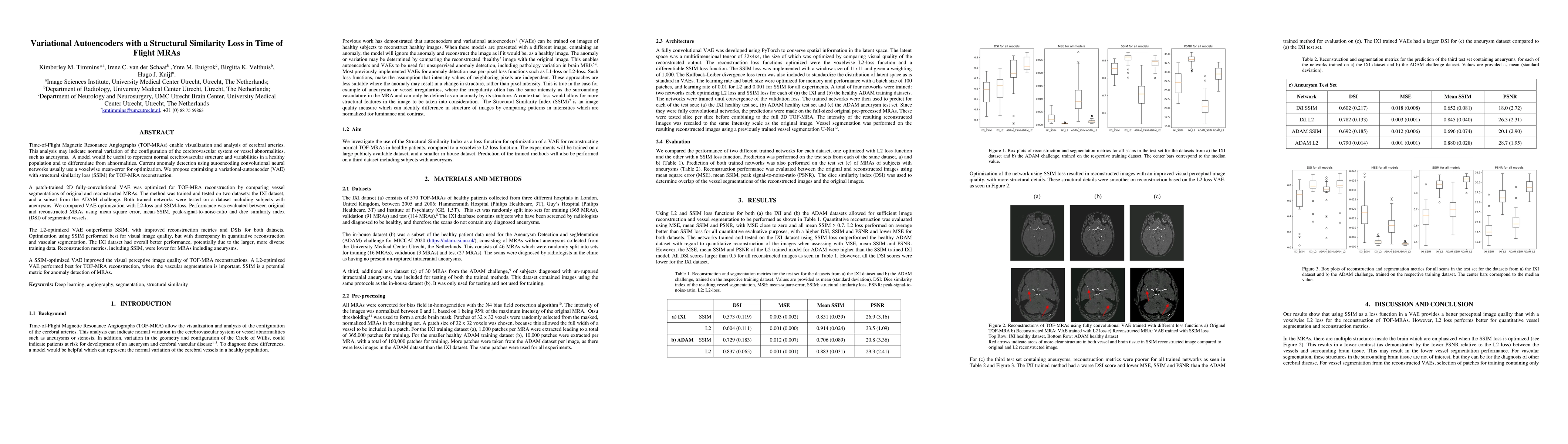 A new approach to reconstructing Time-of-Flight Magnetic Resonance Angiographs (TOF-MRAs) using Variational Autoencoders with Structural Similarity Loss is proposed, outperforming a traditional L2-loss optimization method in terms of vascular segmentation accuracy while improving visual image quality.