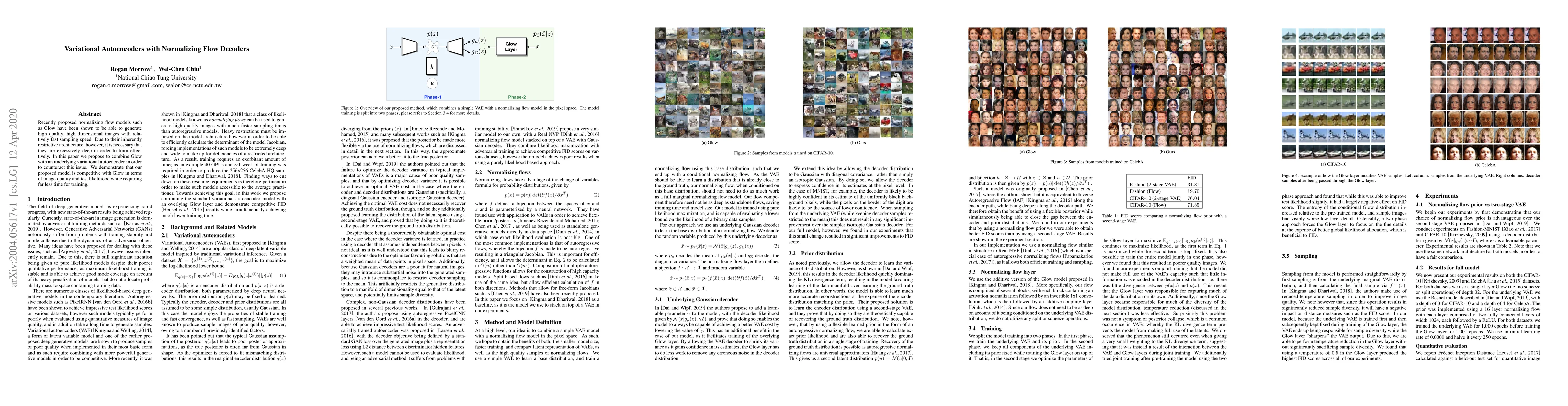 This paper proposes a hybrid model combining variational autoencoders with Glow's normalizing flow decoders to improve training efficiency while maintaining high-quality image generation and fast sampling speed. The proposed model achieves better training times compared to standalone Glow models.