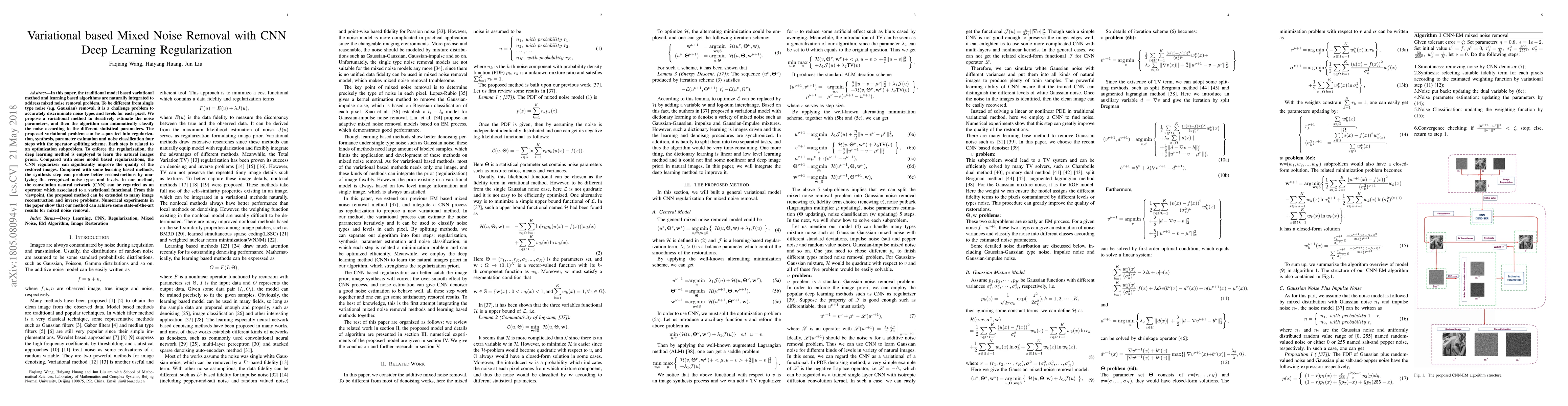 The paper proposes a variational mixed noise removal model integrating CNN deep learning regularization. It employs an operator splitting method to separate the model into noise removal (based on CNN regularization), synthesis, parameter estimation, and noise classification steps, each efficiently optimizable including CNN-based denoising.
