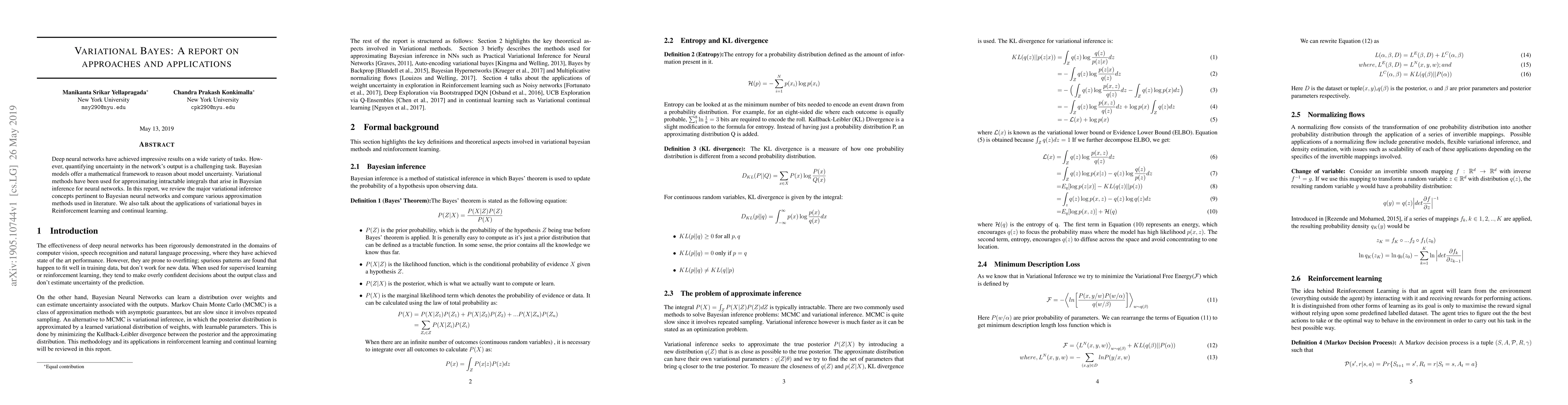 This report reviews variational inference methods for approximating Bayesian neural networks, comparing various approximation techniques, and discusses applications in reinforcement learning and continual learning to quantify uncertainty in deep neural networks.