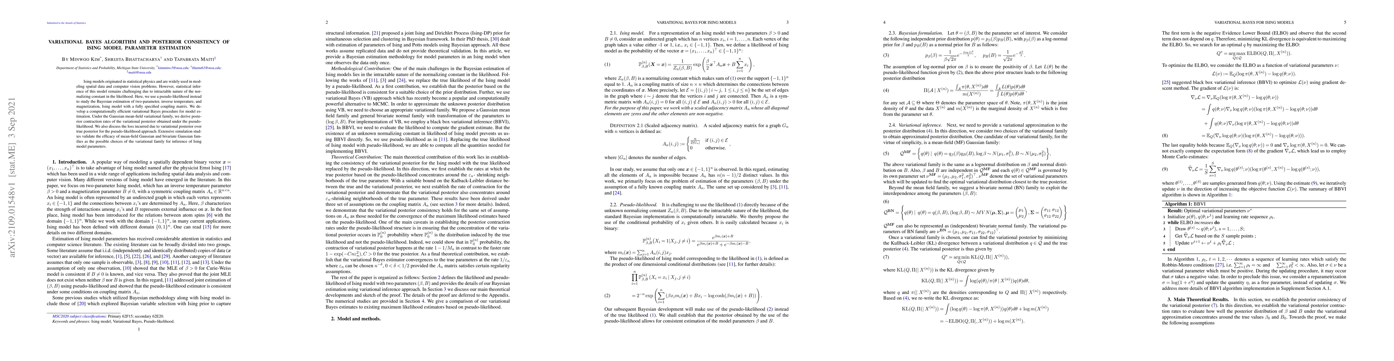 This paper develops a variational Bayes algorithm for estimating parameters in an Ising model using a pseudo-likelihood approach, demonstrating posterior consistency and contraction rates under Gaussian mean-field approximations. Simulation studies validate the effectiveness of mean-field Gaussian and bivariate Gaussian families for parameter inference.