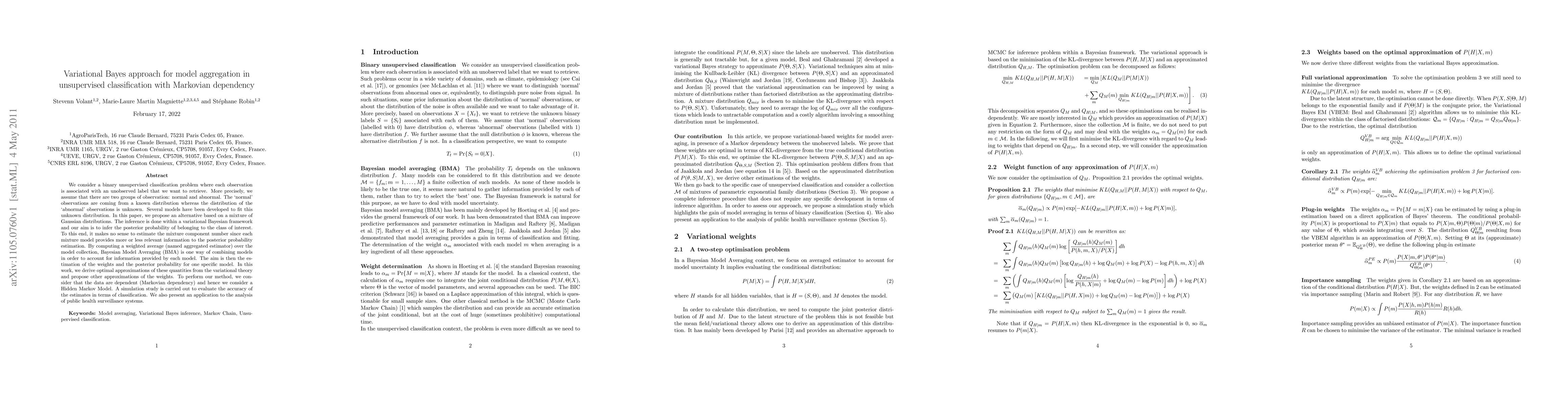 We consider a binary unsupervised classification problem where each observation is associated with an unobserved label that we want to retrieve. More precisely, we assume that there are two groups of observation: normal and abnormal. The `normal' observations are coming from a known distribution whereas the distribution of the `abnormal' observations is unknown. Several models have been developed to fit this unknown distribution. In this paper, we propose an alternative based on a mixture of Gaussian distributions. The inference is done within a variational Bayesian framework and our aim is to infer the posterior probability of belonging to the class of interest. To this end, it makes no sense to estimate the mixture component number since each mixture model provides more or less relevant information to the posterior probability estimation. By computing a weighted average (named aggregated estimator) over the model collection, Bayesian Model Averaging (BMA) is one way of combining models in order to account for information provided by each model. The aim is then the estimation of the weights and the posterior probability for one specific model. In this work, we derive optimal approximations of these quantities from the variational theory and propose other approximations of the weights. To perform our method, we consider that the data are dependent (Markovian dependency) and hence we consider a Hidden Markov Model. A simulation study is carried out to evaluate the accuracy of the estimates in terms of classification. We also present an application to the analysis of public health surveillance systems.