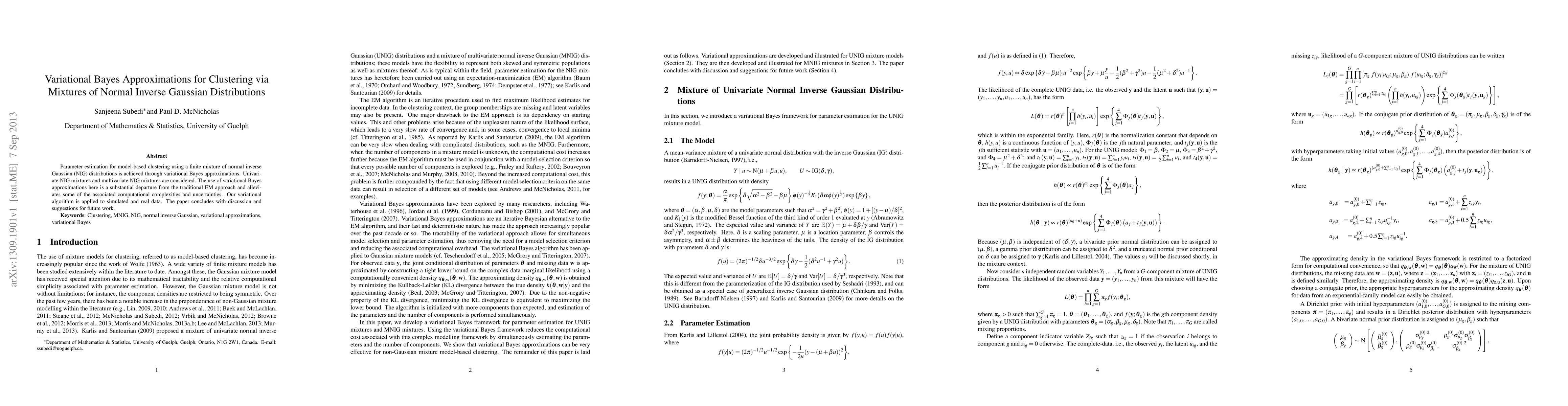 The paper introduces variational Bayes approximations for clustering using mixtures of normal inverse Gaussian distributions, contrasting with traditional EM methods to reduce computational complexities. The proposed algorithm is tested on both simulated and real data, with conclusions and future research directions provided.