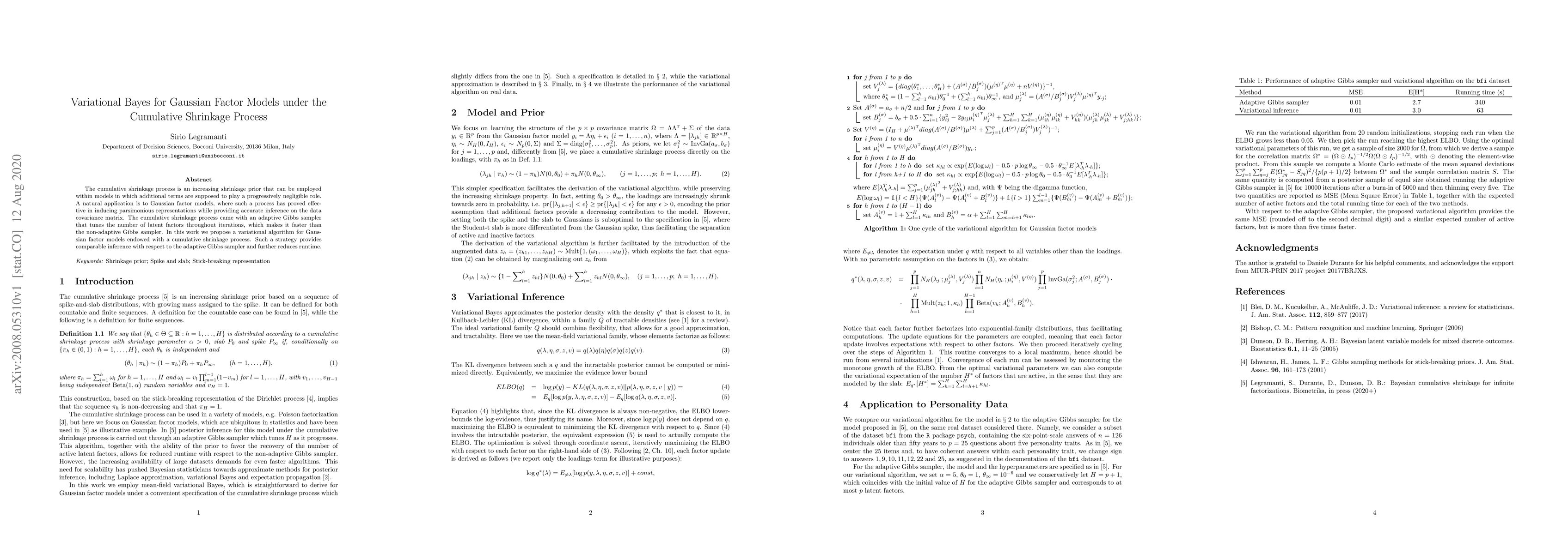 The paper proposes a variational algorithm for Gaussian factor models with a cumulative shrinkage process, which offers comparable inference to an adaptive Gibbs sampler while reducing runtime.