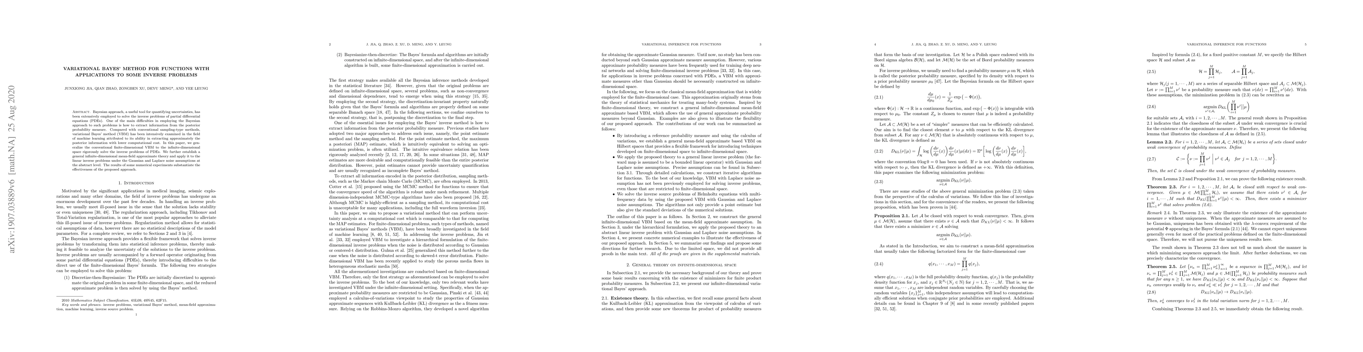 Bayesian approach, as a useful tool for quantifying uncertainties, has been widely used for solving inverse problems of partial differential equations (PDEs). One of the key difficulties for employing Bayesian approach for the issue is how to extract information from the posterior probability measure. Variational Bayes' method (VBM) is firstly and broadly studied in the field of machine learning, which has the ability to extract posterior information approximately by using much lower computational resources compared with the conventional sampling type methods. In this paper, we generalize the usual finite-dimensional VBM to infinite-dimensional space, which makes the usage of VBM for inverse problems of PDEs rigorously. We further establish general infinite-dimensional mean-field approximate theory, and apply this theory to abstract linear inverse problems with Gaussian and Laplace noise assumptions. The results on some numerical examples substantiate the effectiveness of the proposed approach.