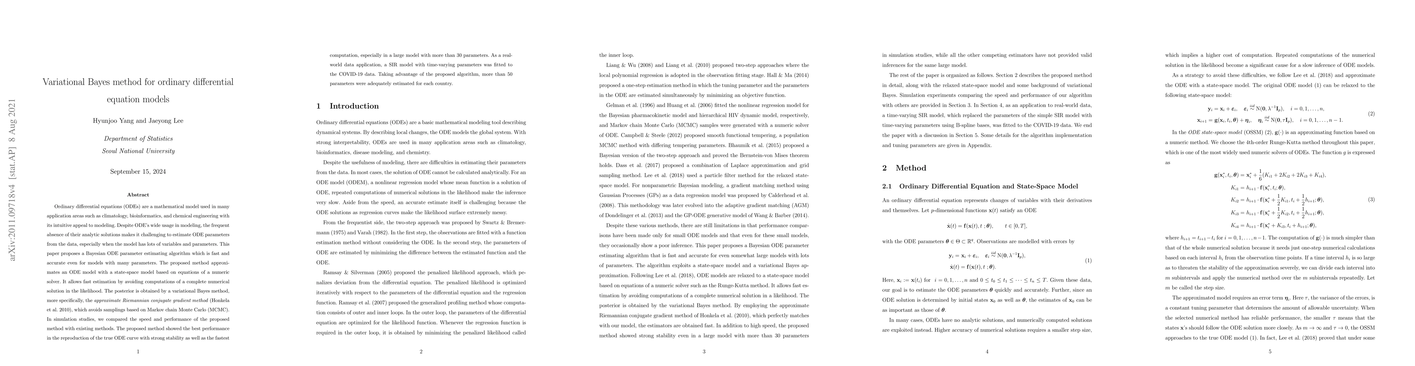 Ordinary differential equations (ODEs) are a mathematical model used in many application areas such as climatology, bioinformatics, and chemical engineering with its intuitive appeal to modeling. Despite ODE's wide usage in modeling, the frequent absence of their analytic solutions makes it challenging to estimate ODE parameters from the data, especially when the model has lots of variables and parameters. This paper proposes a Bayesian ODE parameter estimating algorithm which is fast and accurate even for models with many parameters. The proposed method approximates an ODE model with a state-space model based on equations of a numeric solver. It allows fast estimation by avoiding computations of a complete numerical solution in the likelihood. The posterior is obtained by a variational Bayes method, more specifically, the approximate Riemannian conjugate gradient method (Honkela et al. 2010), which avoids samplings based on Markov chain Monte Carlo (MCMC). In simulation studies, we compared the speed and performance of the proposed method with existing methods. The proposed method showed the best performance in the reproduction of the true ODE curve with strong stability as well as the fastest computation, especially in a large model with more than 30 parameters. As a real-world data application, a SIR model with time-varying parameters was fitted to the COVID-19 data. Taking advantage of the proposed algorithm, more than 50 parameters were adequately estimated for each country.