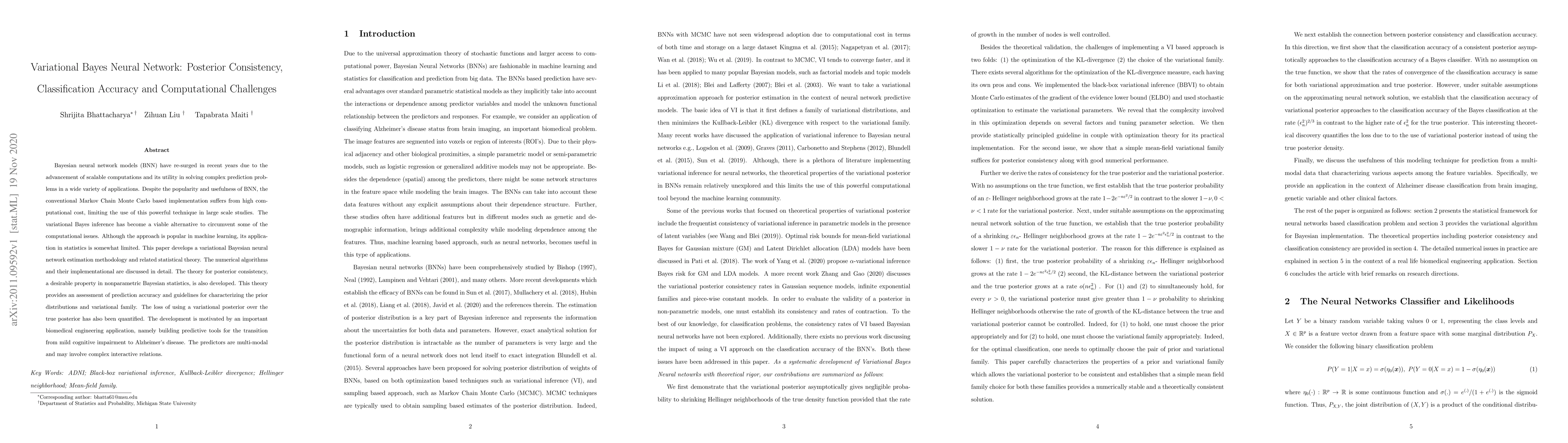 This paper proposes a variational Bayesian neural network methodology to address computational challenges in Bayesian neural networks, focusing on posterior consistency, classification accuracy, and implementation. It develops statistical theory for posterior consistency and quantifies the loss from using a variational posterior, motivated by its application in predicting Alzheimer's disease progression from mild cognitive impairment.