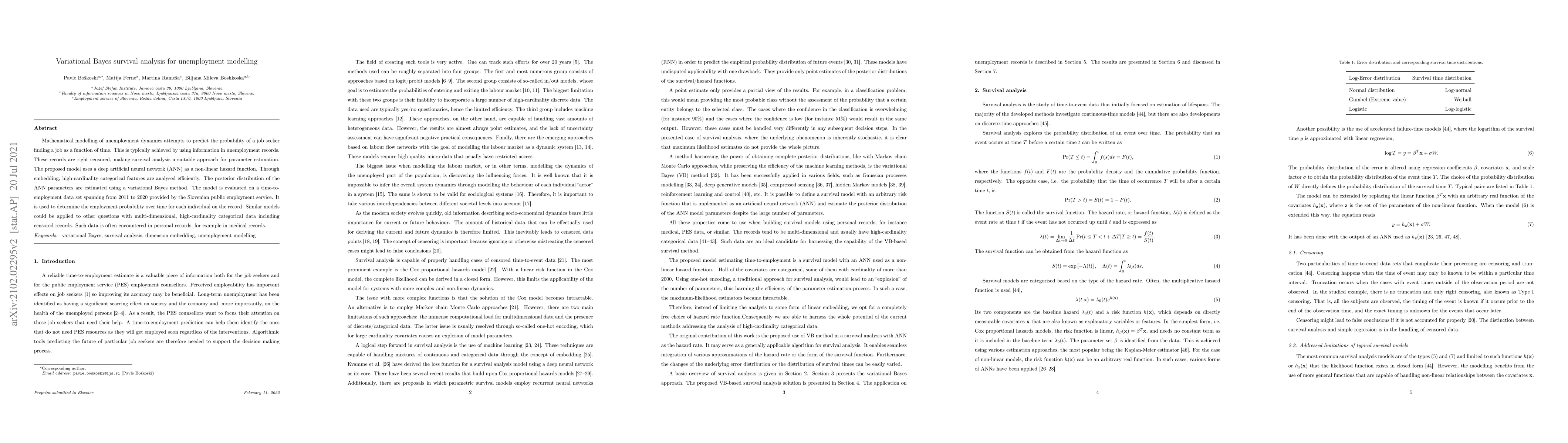 This paper proposes a variational Bayes survival analysis model using a deep ANN to predict job-finding probabilities over time for unemployed individuals, with high-cardinality categorical features efficiently handled through embedding. The model is evaluated on Slovenian employment data from 2011 to 2020, demonstrating its potential for broader applications in censored records analysis.