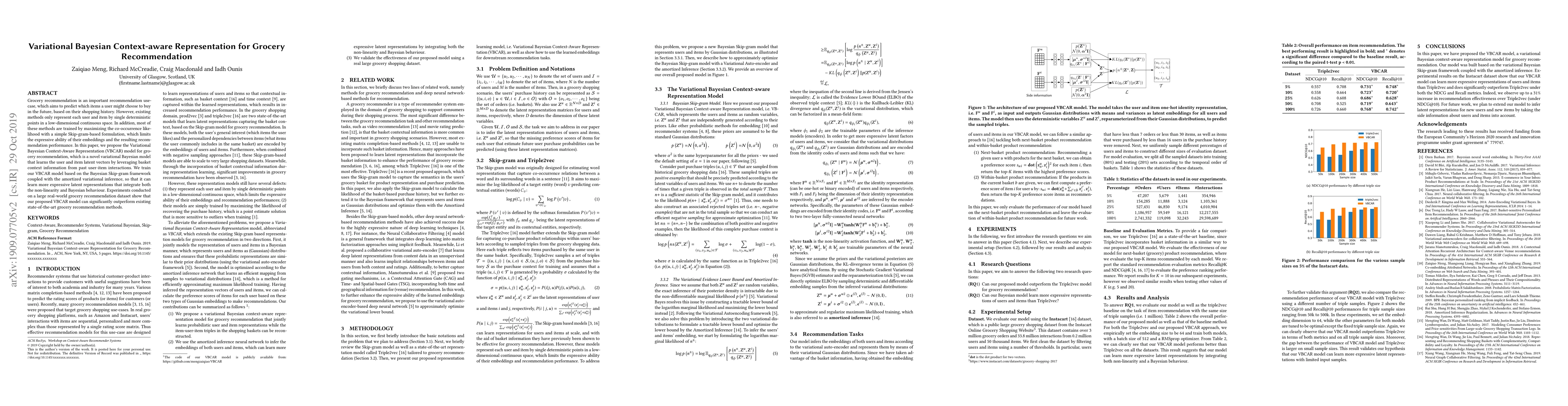The paper introduces a Variational Bayesian Context-Aware Representation (VBCAR) model for grocery recommendation, leveraging basket context information to learn more expressive latent vectors. The VBCAR model outperforms existing methods by integrating non-linearity and Bayesian behavior through Bayesian Skip-gram and amortized variational inference.