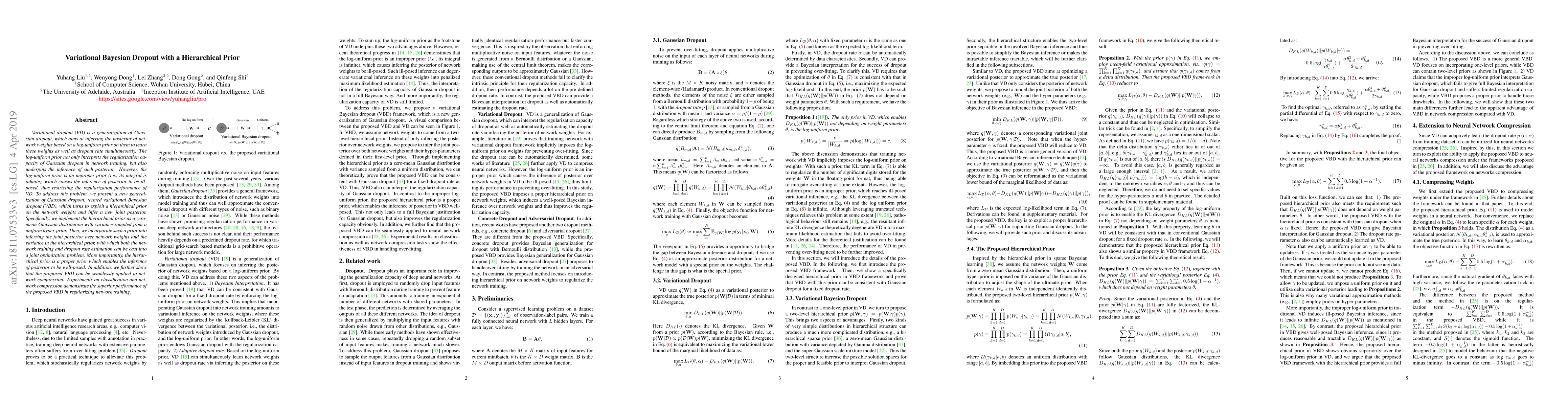 The paper introduces variational Bayesian dropout (VBD), a method that uses a hierarchical prior to infer the posterior of network weights and dropout rates, addressing the improper prior issue in variational dropout. The hierarchical prior, a zero-mean Gaussian with variance from a uniform hyper-prior, enables well-posed posterior inference, enhancing regularization performance and facilitating network compression.