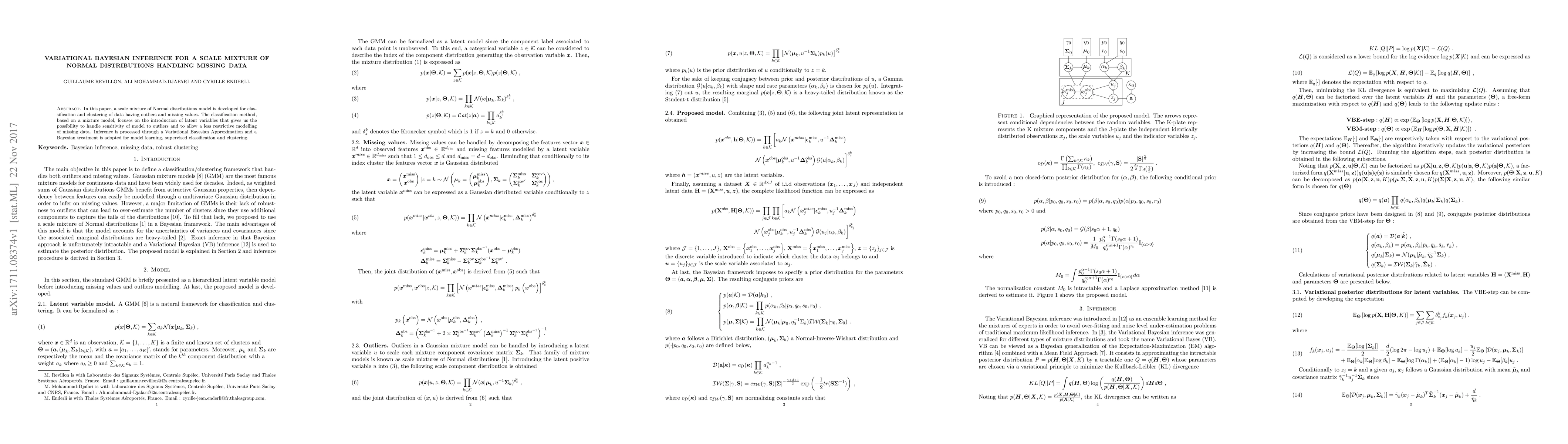 This paper develops a scale mixture of Normal distributions model for classification and clustering of data with outliers and missing values, utilizing latent variables and Variational Bayesian Inference for robust handling and Bayesian methods for model learning and supervised classification.