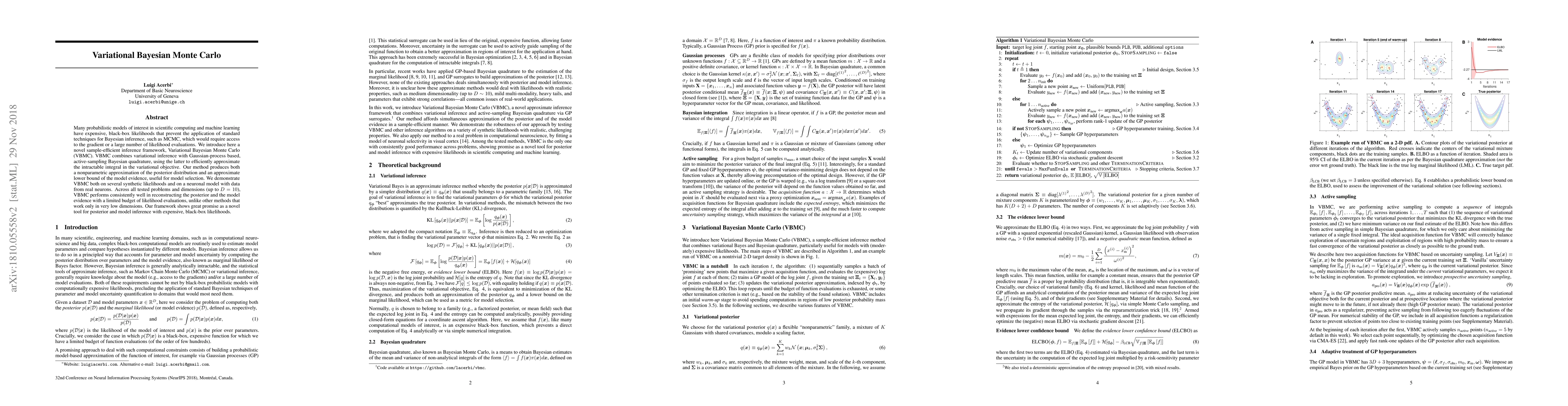Variational Bayesian Monte Carlo (VBMC) combines variational inference with active-sampling Bayesian quadrature to efficiently approximate intractable integrals in Bayesian inference, offering a sample-efficient framework for expensive, black-box likelihoods. VBMC demonstrates consistent performance in reconstructing posteriors and model evidence across various dimensions and applications.