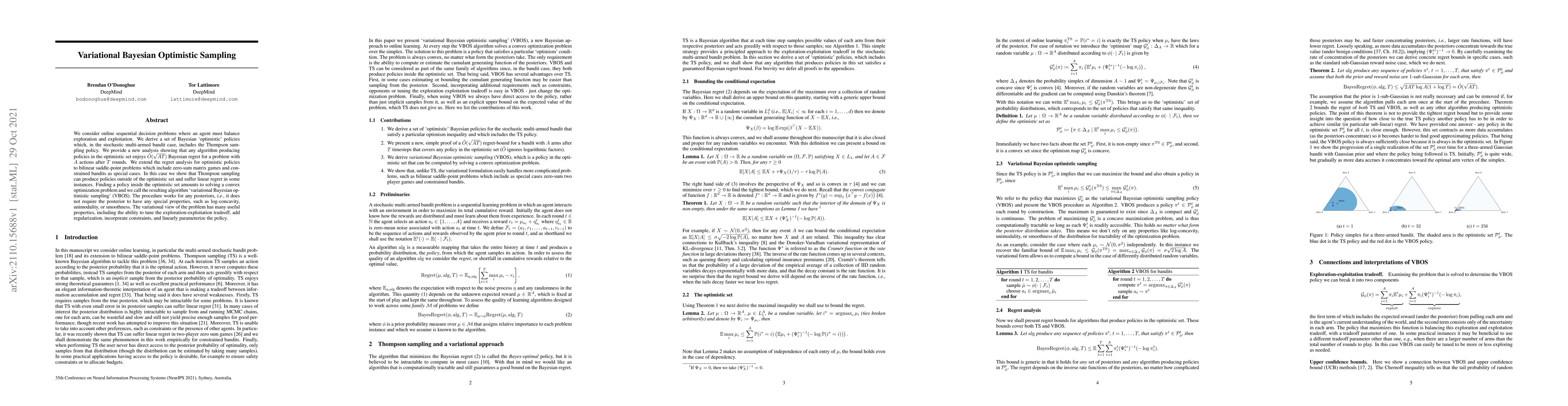 This paper introduces variational Bayesian optimistic sampling (VBOS) for online sequential decision problems, balancing exploration and exploitation with Bayesian policies. It demonstrates $\tilde O(\sqrt{AT})$ Bayesian regret for algorithms within the optimistic set, extending this analysis to saddle-point problems, and highlights the flexibility of the variational approach in tuning, regularization, and constraint incorporation.