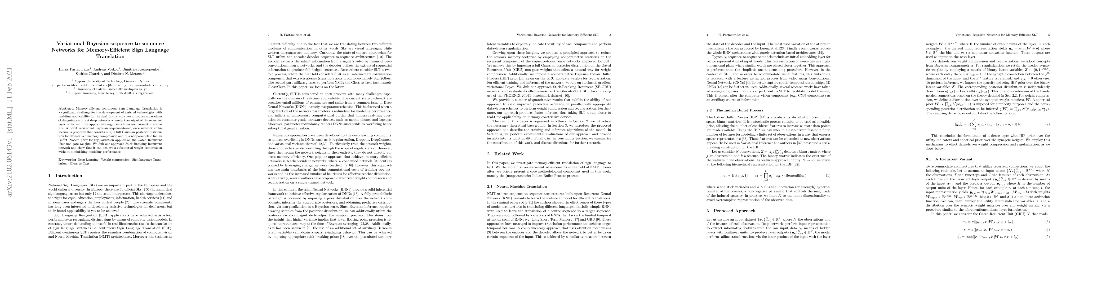 This paper proposes a variational Bayesian sequence-to-sequence network for memory-efficient continuous Sign Language Translation, utilizing a Stick-Breaking Recurrent architecture with a full Gaussian posterior and a nonparametric Indian Buffet Process prior to achieve significant weight compression without sacrificing translation performance.