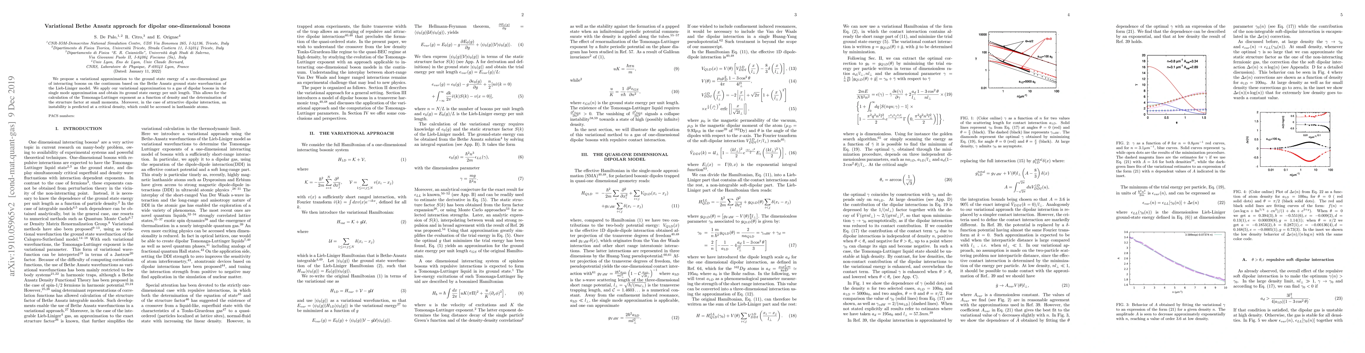 We propose a variational approximation to the ground state energy of a one-dimensional gas of interacting bosons on the continuum based on the Bethe Ansatz ground state wavefunction of the Lieb-Liniger model. We apply our variational approximation to a gas of dipolar bosons in the single mode approximation and obtain its ground state energy per unit length. This allows for the calculation of the Tomonaga-Luttinger exponent as a function of density and the determination of the structure factor at small momenta. Moreover, in the case of attractive dipolar interaction, an instability is predicted at a critical density, which could be accessed in lanthanide atoms.