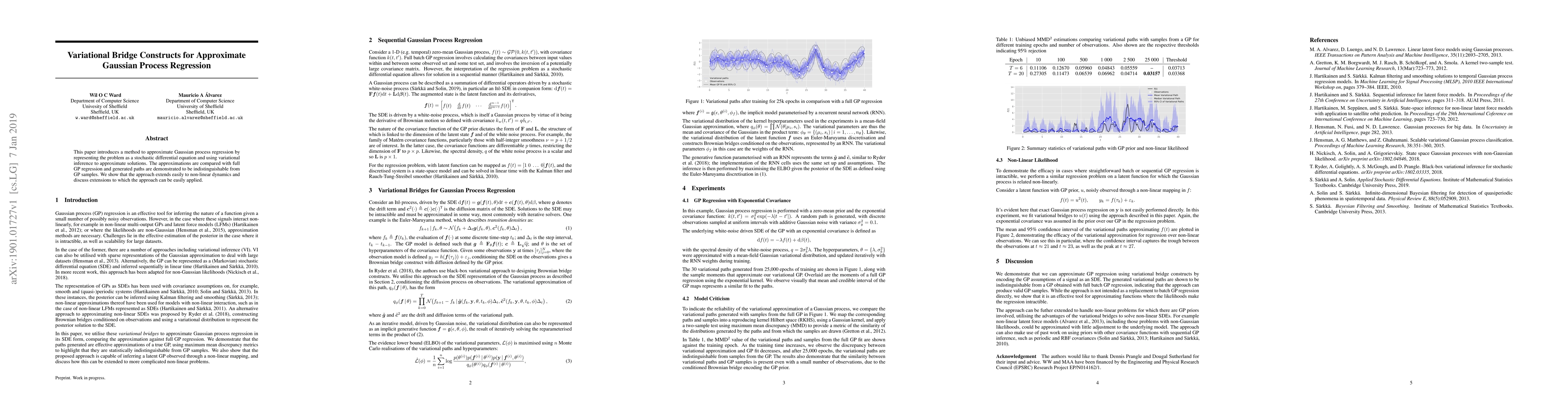 This paper proposes a variational bridge method to approximate Gaussian process regression by framing it as a stochastic differential equation and using variational inference. The method's approximations are shown to be indistinguishable from full Gaussian process samples and extend seamlessly to non-linear dynamics.