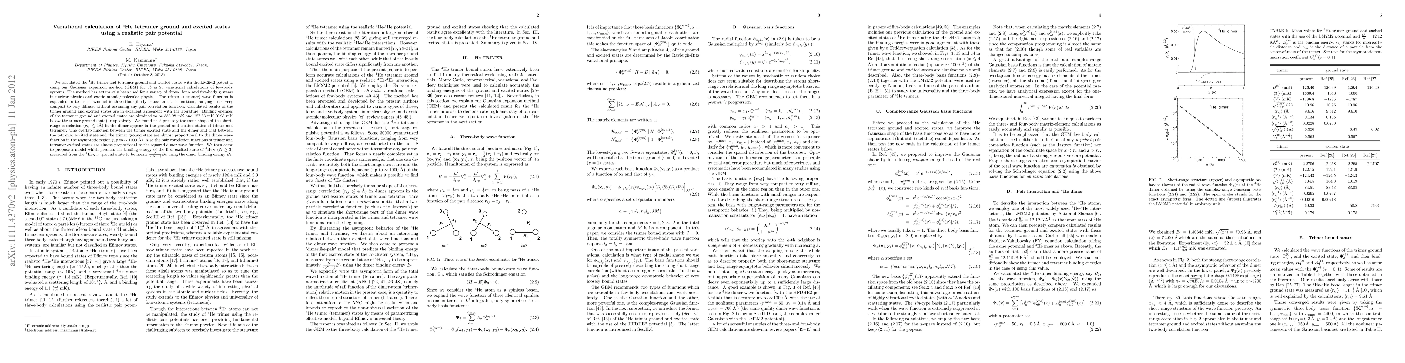 We calculated the 4He trimer and tetramer ground and excited states with the LM2M2 potential using our Gaussian expansion method (GEM) for ab initio variational calculations of few-body systems. The method has extensively been used for a variety of three-, four- and five-body systems in nuclear physics and exotic atomic/molecular physics. The trimer (tetramer) wave function is expanded in terms of symmetric three-(four-)body Gaussian basis functions, ranging from very compact to very diffuse, without assuming any pair correlation function. Calculated results of the trimer ground and excited states are in excellent agreement with the literature. Binding energies of the tetramer ground and excited states are obtained to be 558.98 mK and 127.33 mK (0.93 mK below the trimer ground state), respectively. Precisely the same shape of the short-range correlation (r_ij < 4 \AA) in the dimer appear in the ground and excited states of the trimer and tetramer. Analyzing the asymptotic wave functions (accurate up to 1000 \AA) of those excited states, we propose a model which predicts the binding energy of the first excited state of 4He_N measured from the 4He_{N-1} ground state to be N/2(N-1)xB_2 using dimer binding energy B_2 only; fit in N=3 and 4 is excellent.