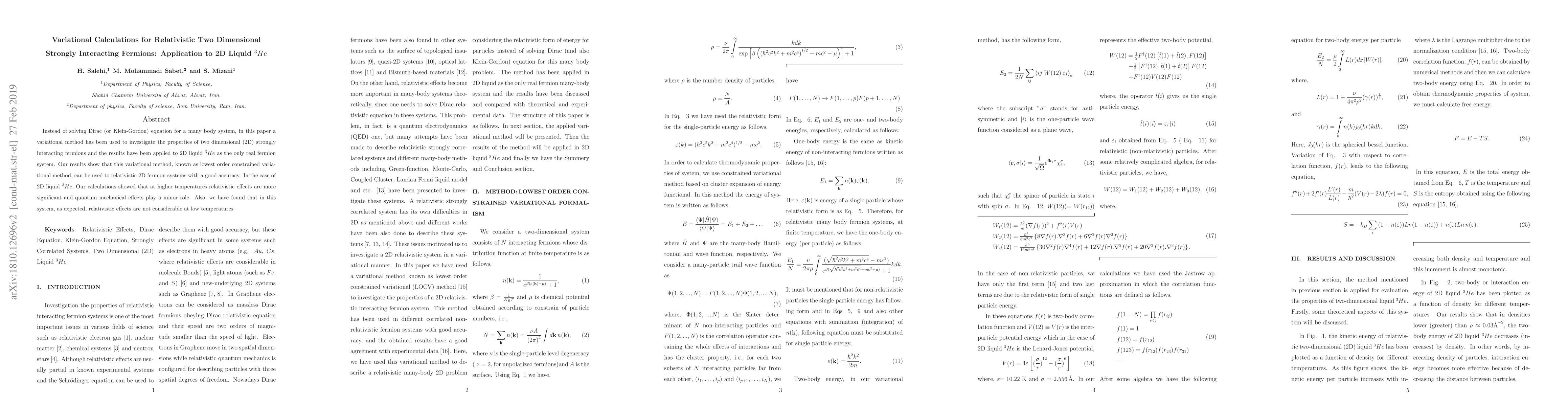This paper employs a variational method to study the properties of relativistic two-dimensional strongly interacting fermions, specifically applying it to 2D liquid $^3He$. The results indicate that the lowest order constrained variational method provides accurate results for such systems, with relativistic effects becoming more significant at higher temperatures.
