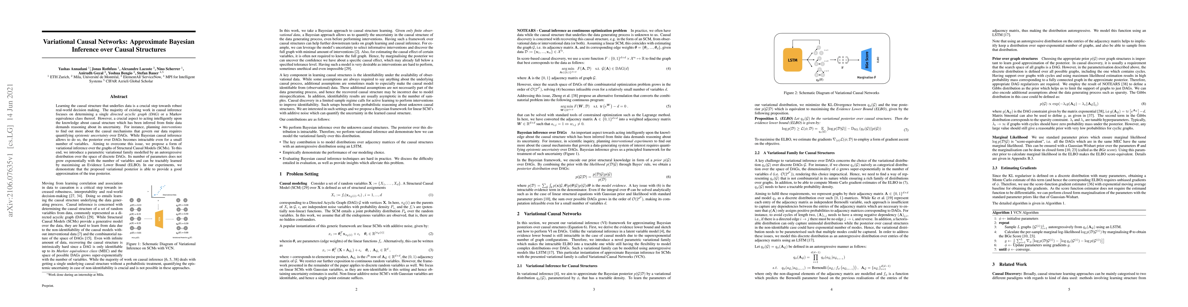 This paper proposes a variational inference method for approximating the Bayesian posterior over causal structures represented by directed acyclic graphs (DAGs) in Structural Causal Models. It introduces a scalable parametric variational family that can be efficiently learned, providing a tractable solution to the intractable posterior problem in Bayesian causal inference.