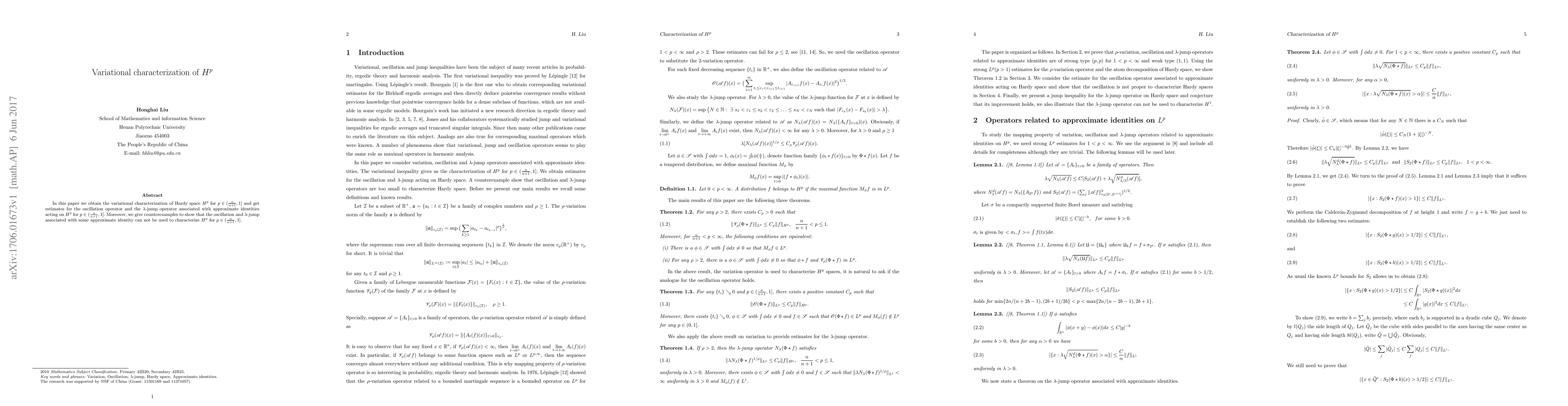 In this paper we obtain the variational characterization of Hardy space $H^p$ for $p\in(\frac n{n+1},1]$ and get estimates for the oscillation operator and the $\lambda$-jump operator associated with approximate identities acting on $H^p$ for $p\in(\frac n{n+1},1]$. Moreover, we give counterexamples to show that the oscillation and $\lambda$-jump associated with some approximate identity can not be used to characterize $H^p$ for $p\in(\frac n{n+1},1]$.