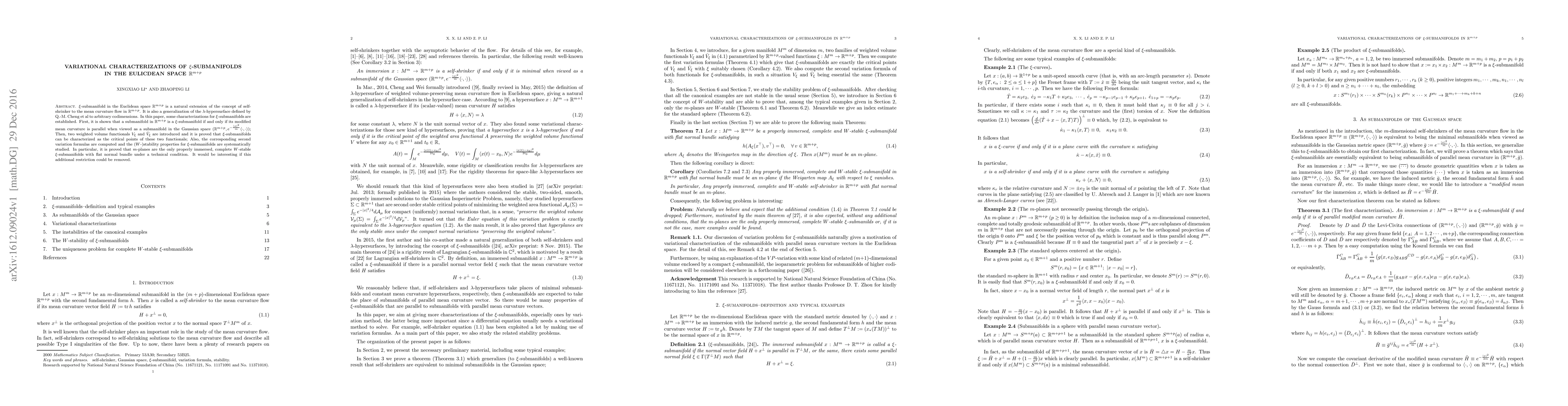 $\xi$-submanifold in the Euclidean space $\bbr^{m+p}$ is a natural extension of the concept of self-shrinker to the mean curvature flow in $\bbr^{m+p}$. It is also a generalization of the $\lambda$-hypersurface defined by Q.-M. Cheng et al to arbitrary codimensions. In this paper, some characterizations for $\xi$-submanifolds are established. First, it is shown that a submanifold in $\bbr^{m+p}$ is a $\xi$-submanifold if and only if its modified mean curvature is parallel when viewed as a submanifold in the Gaussian space $(\bbr^{m+p},e^{-\fr{|x|^2}{m}}\lagl\cdot,\cdot\ragl)$; Then, two weighted volume functionals $V_\xi$ and $\bar V_\xi$ are introduced and it is proved that $\xi$-submanifolds can be characterized as the critical points of these two functionals; Also, the corresponding second variation formulas are computed and the ($W$-)stability properties for $\xi$-submanifolds are systematically studied. In particular, it is proved that $m$-planes are the only properly immersed, complete $W$-stable $\xi$-submanifolds with flat normal bundle under a technical condition. It would be interesting if this additional restriction could be removed.