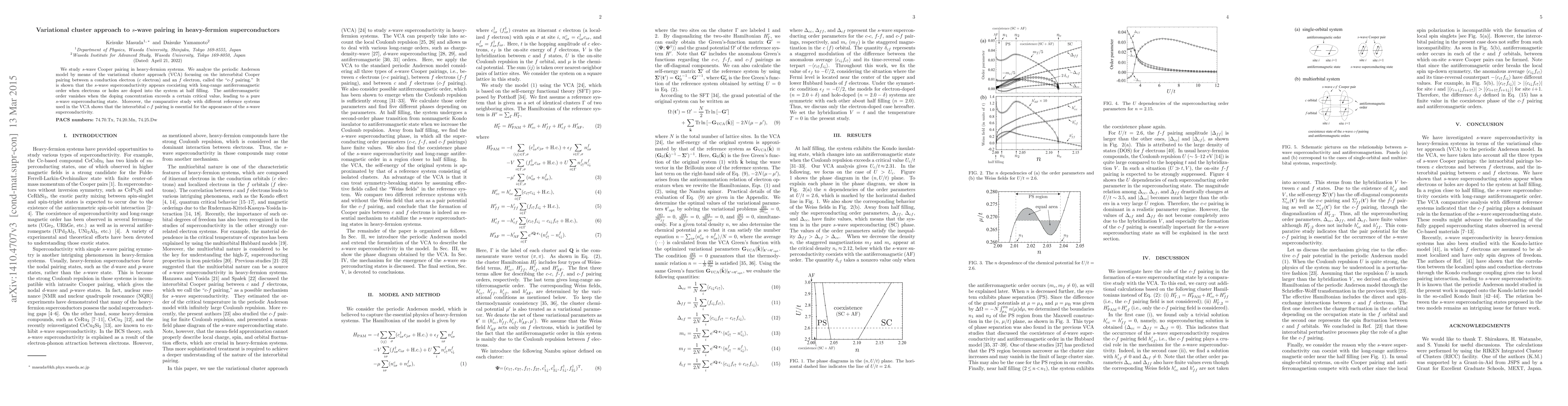 This paper employs the variational cluster approach to investigate s-wave Cooper pairing in heavy-fermion superconductors, specifically focusing on the interorbital $c$-$f$ pairing. It finds that s-wave superconductivity emerges alongside antiferromagnetic order with doping, which disappears at a critical doping level, resulting in pure s-wave superconductivity.