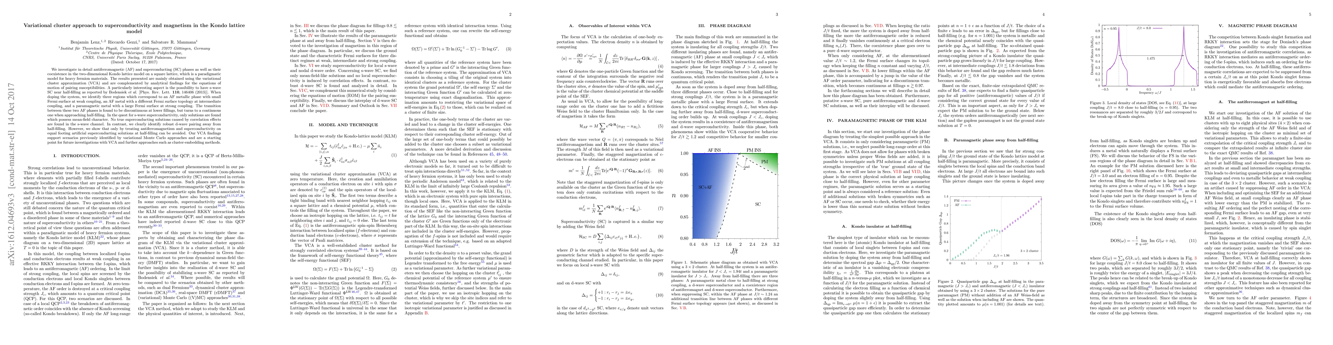 This paper uses the variational cluster approximation (VCA) to study the Kondo lattice model, focusing on antiferromagnetic and superconducting phases, including their coexistence in a two-dimensional square lattice. The study reveals distinct phases and transitions, identifies robust d-wave pairing, and shows that s-wave superconductivity lacks true correlation effects, supporting previous variational Monte Carlo findings.