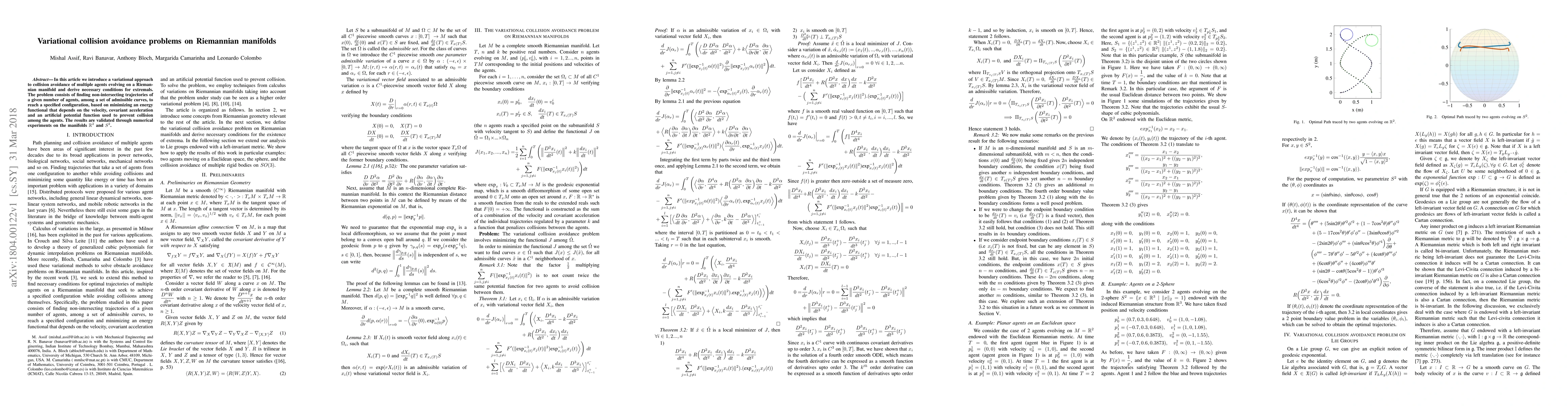 This paper proposes a variational method for collision avoidance among multiple agents on Riemannian manifolds, deriving necessary conditions for optimal trajectories that minimize an energy functional while preventing intersections. Numerical experiments validate the approach on $\mathbb{R}^{2}$ and $S^2$.
