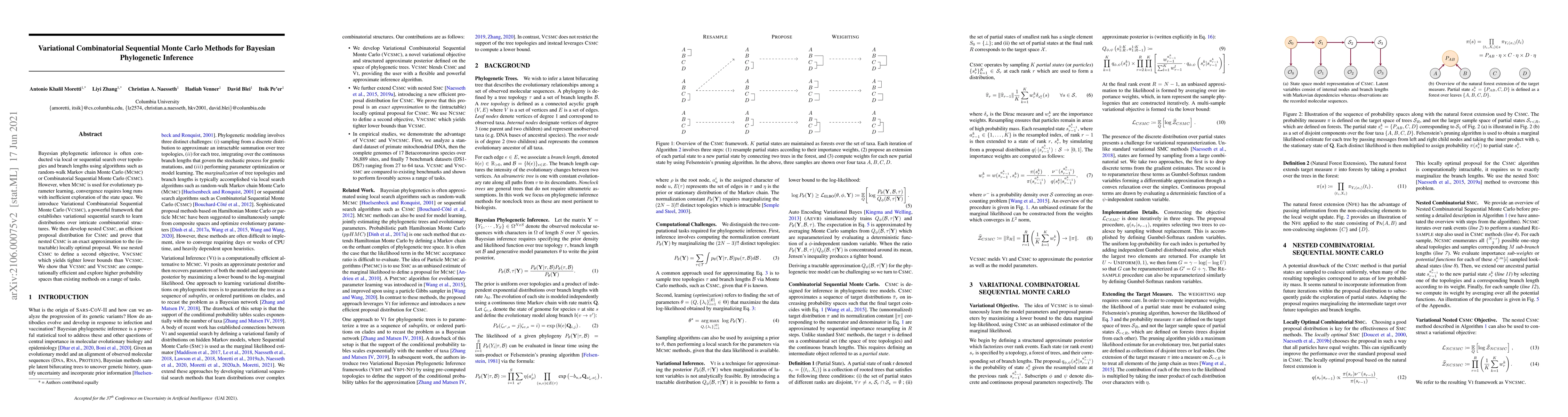 This paper introduces Variational Combinatorial Sequential Monte Carlo (VCSMC) for Bayesian phylogenetic inference, addressing the inefficiencies of MCMC. It proposes nested CSMC as an efficient proposal distribution, and VNCSMC for tighter lower bounds, demonstrating improved computational efficiency and broader exploration of the state space compared to existing methods.