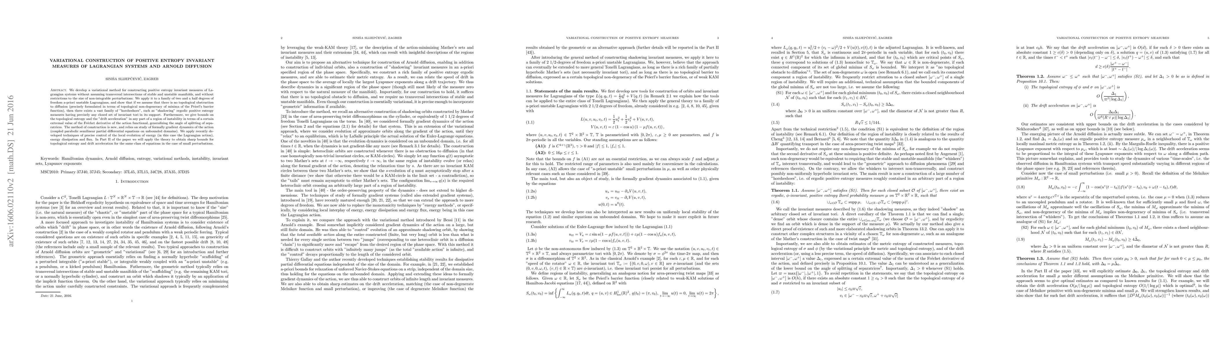 We develop a variational method for constructing positive entropy invariant measures of Lagrangian systems without assuming transversal intersections of stable and unstable manifolds, and without restrictions to the size of non-integrable perturbations. We apply it to a family of two and a half degrees of freedom a-priori unstable Lagrangians, and show that if we assume that there is no topological obstruction to diffusion (precisely formulated in terms of topological non-degeneracy of minima of the Peierl's barrier function), then there exists a vast family of "horsheshoes", such as "shadowing" ergodic positive entropy measures having precisely any closed set of invariant tori in its support. Furthermore, we give bounds on the topological entropy and the "drift acceleration" in any part of a region of instability in terms of a certain extremal value of the Fr\'{e}chet derivative of the action functional, generalizing the angle of splitting of separatrices. The method of construction is new, and relies on study of formally gradient dynamics of the action (coupled parabolic semilinear partial differential equations on unbounded domains). We apply recently developed techniques of precise control of the local evolution of energy (in this case the Lagrangian action), energy dissipation and flux. In Part II of the paper we will apply the theory to obtain sharp bounds for topological entropy and drift acceleration for the same class of equations in the case of small perturbations.