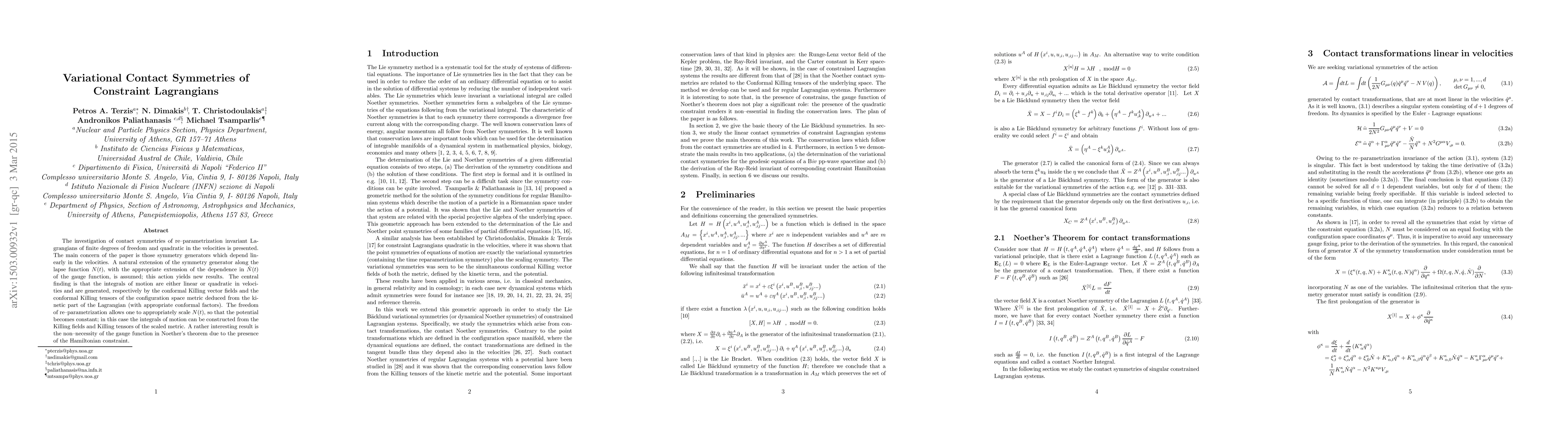 The investigation of contact symmetries of re--parametrization invariant Lagrangians of finite degrees of freedom and quadratic in the velocities is presented. The main concern of the paper is those symmetry generators which depend linearly in the velocities. A natural extension of the symmetry generator along the lapse function $N(t)$, with the appropriate extension of the dependence in $\dot{N}(t)$ of the gauge function, is assumed; this action yields new results. The central finding is that the integrals of motion are either linear or quadratic in velocities and are generated, respectively by the conformal Killing vector fields and the conformal Killing tensors of the configuration space metric deduced from the kinetic part of the Lagrangian (with appropriate conformal factors). The freedom of re--parametrization allows one to appropriately scale $N(t)$, so that the potential becomes constant; in this case the integrals of motion can be constructed from the Killing fields and Killing tensors of the scaled metric. A rather interesting result is the non--necessity of the gauge function in Noether's theorem due to the presence of the Hamiltonian constraint
