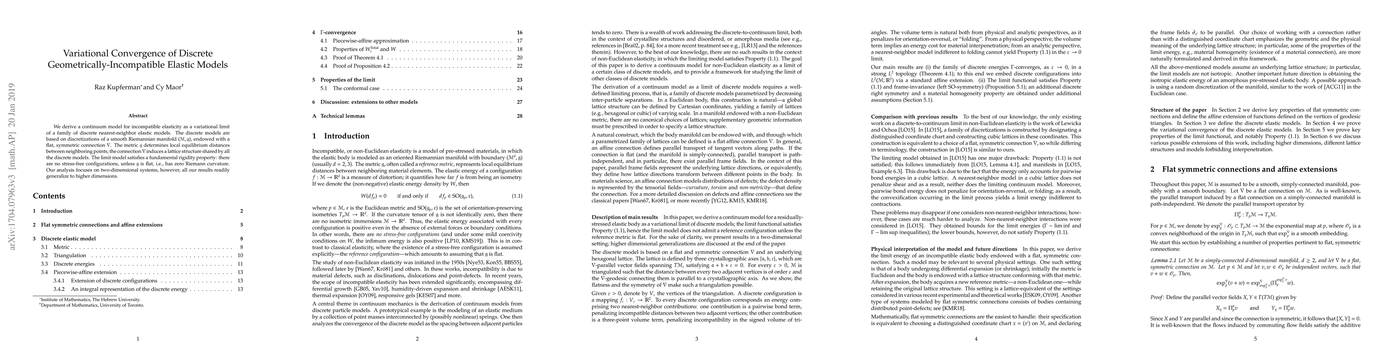 We derive a continuum model for incompatible elasticity as a variational limit of a family of discrete nearest-neighbor elastic models. The discrete models are based on discretizations of a smooth Riemannian manifold $(M,\mathfrak{g})$, endowed with a flat, symmetric connection $\nabla$. The metric $\mathfrak{g}$ determines local equilibrium distances between neighboring points; the connection $\nabla$ induces a lattice structure shared by all the discrete models. The limit model satisfies a fundamental rigidity property: there are no stress-free configurations, unless $\mathfrak{g}$ is flat, i.e., has zero Riemann curvature. Our analysis focuses on two-dimensional systems, however, all our results readily generalize to higher dimensions.