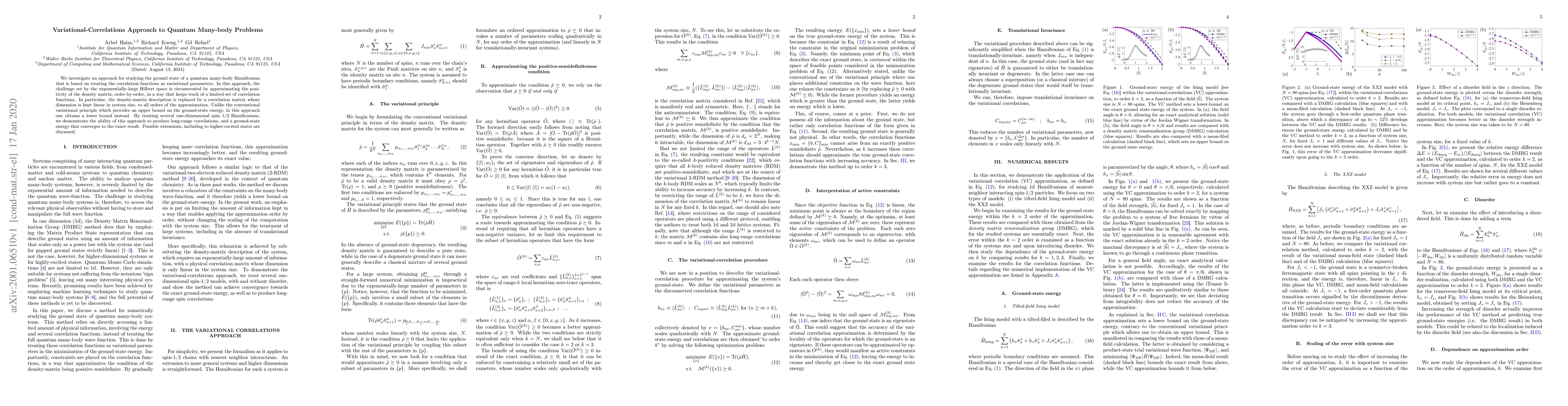 This paper proposes a variational-correlations approach to tackle quantum many-body problems by using correlation functions as variational parameters, achieving a lower bound on the ground-state energy and demonstrating convergence to exact results for one-dimensional spin $1/2$ Hamiltonians. The method maintains a linear-dimensional correlation matrix, simplifying the exponentially-large Hilbert space.