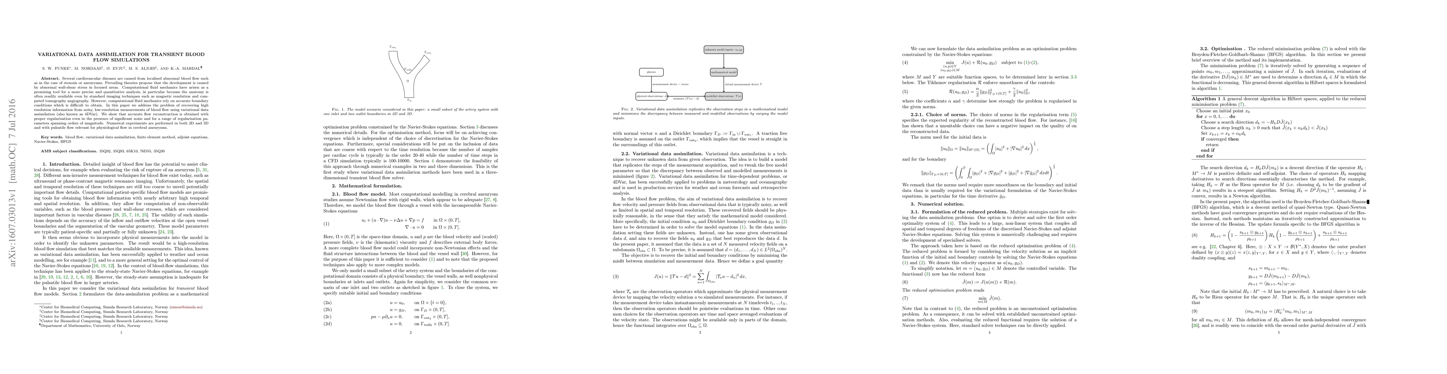 Several cardiovascular diseases are caused from localised abnormal blood flow such as in the case of stenosis or aneurysms. Prevailing theories propose that the development is caused by abnormal wall-shear stress in focused areas. Computational fluid mechanics have arisen as a promising tool for a more precise and quantitative analysis, in particular because the anatomy is often readily available even by standard imaging techniques such as magnetic resolution and computed tomography angiography. However, computational fluid mechanics rely on accurate boundary conditions which is difficult to obtain. In this paper we address the problem of recovering high resolution information from noisy, low-resolution measurements of blood flow using variational data assimilation (also known as 4DVar). We show that accurate flow reconstruction is obtained with proper regularisation even in the presence of significant noise and for a range of regularisation parameters spanning orders of magnitude. Numerical experiments are performed in both 2D and 3D and with pulsatile flow relevant for physiological flow in cerebral aneurysms.