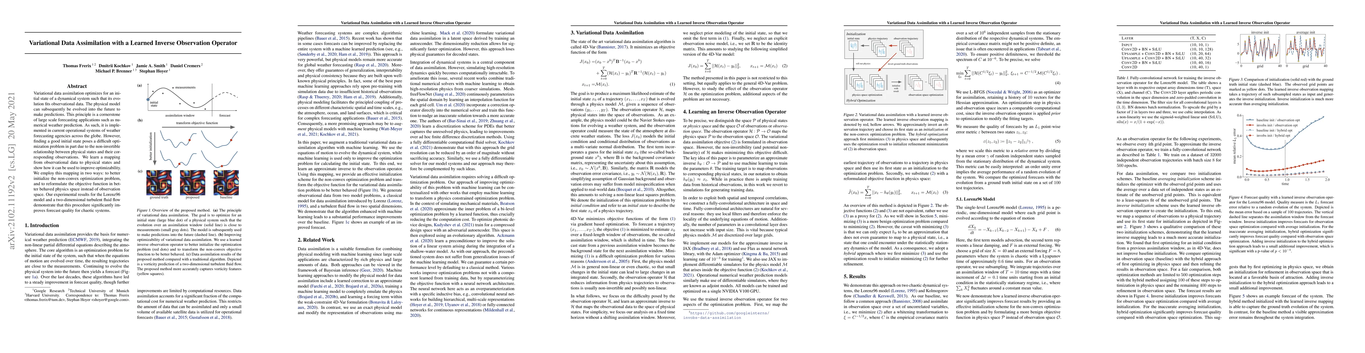 This paper proposes a variational data assimilation method that uses a learned inverse observation operator to improve the optimization of initial states for dynamical systems. The approach enhances forecast quality by initializing the optimization problem and reformulating the objective function in a more manageable physics space, demonstrated through improved results in the Lorenz96 model and turbulent fluid flow simulations.