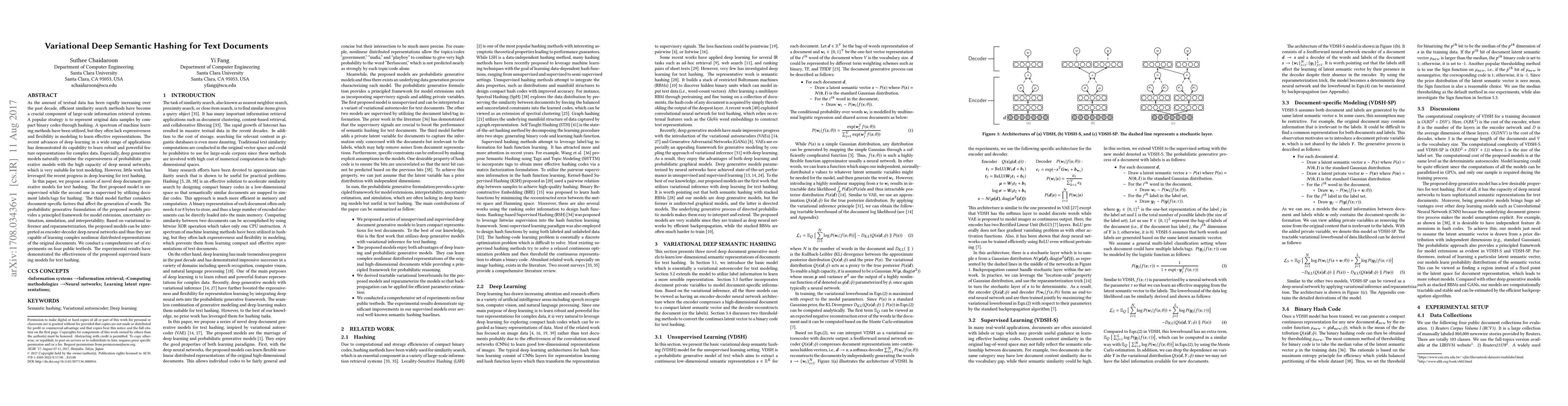 This paper introduces a variational deep semantic hashing method for text documents, proposing several generative models to efficiently encode documents into compact binary codes. The models combine deep learning with probabilistic generative techniques, enabling effective representation learning and showing superior performance in text hashing tasks compared to traditional methods.
