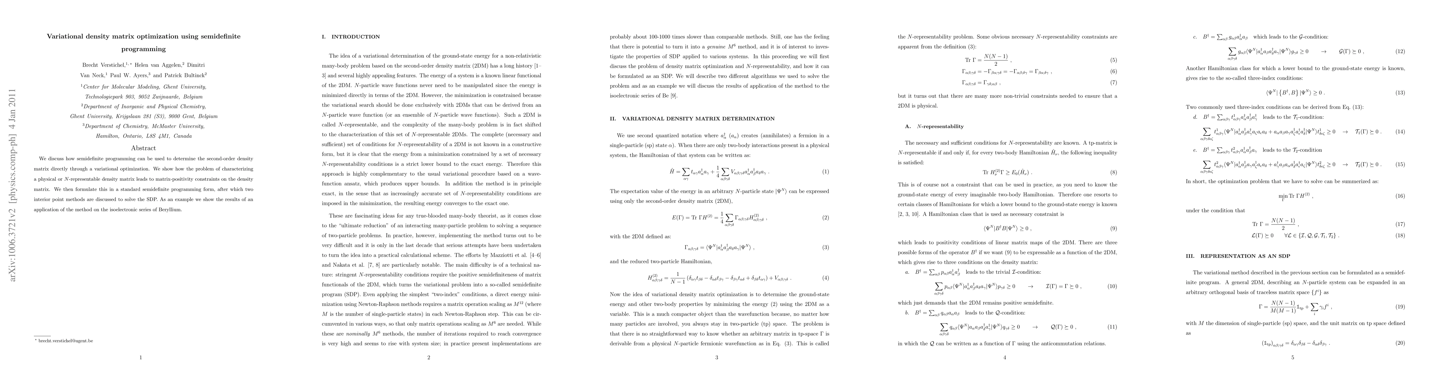 We discuss how semidefinite programming can be used to determine the second-order density matrix directly through a variational optimization. We show how the problem of characterizing a physical or N -representable density matrix leads to matrix-positivity constraints on the density matrix. We then formulate this in a standard semidefinite programming form, after which two interior point methods are discussed to solve the SDP. As an example we show the results of an application of the method on the isoelectronic series of Beryllium.